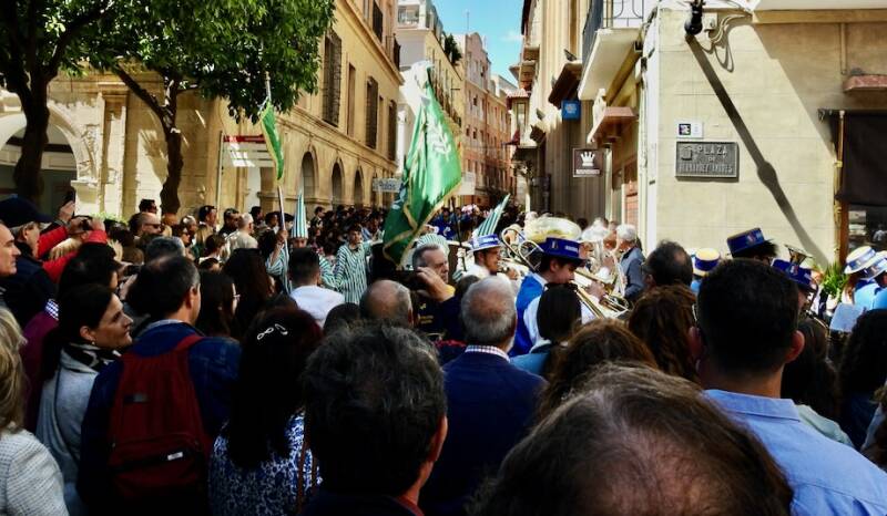 Erg veel hebben we niet kunnen zien van de stad maar we hebben wel plezier gehad. We wilden naar de kathedraal lopen vanaf de tramhalte en het werd hoe langer hoe drukker, dat zal wel komen omdat het zaterdag is dachten we nog. Uit bars schalde oorverdovende muziek en er waren heel veel ouders met kinderen die naar het centrum liepen. Mensen waren goed gekleed, feestelijk leek het. Op een gegeven moment hoorden we ritmisch getrommel en bleek dat er een optocht begon die kilometers lang blijkt te zijn hebben we achteraf gelezen. De zaterdag na pasen vindt er een feest plaats dat de Entierro de la Sardina, de ‘begrafenis van de sardine’ heet. Een folkloristisch gebeuren met carnavaleske trekken , wat al een lange traditie heeft. Ieder jaar weer komen tienduizenden bezoekers naar Murcia om dit feest bij te wonen, het gaat uren door totdat er diep in de nacht een hele grote kartonnen sardine wordt verbrand naast het stadhuis. Maar in het begin van de middag, het gedeelte wat wij hebben meegemaakt, wordt er door mensen die meelopen met de vele muziekgroepen in de optocht, snoep, speelgoed en fluitjes uitgedeeld aan kinderen. Horen en zien vergaat je door het schrille geluid van de fluitjes, vermengd met de muziek van de orkestjes , een kakofonie. We hebben het een tijdje staan aankijken wat nog niet meevalt door de mensenmassa. Heel leuk om mee te maken maar ook vanwege corona niet zo verstandig om tussen die mensenmassa te staan. Bovendien waren de straten soms erg nauw. Gelukkig stond er veel wind waardoor er weinig kans op besmetting is.