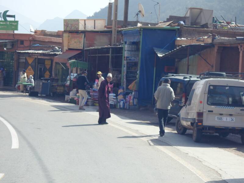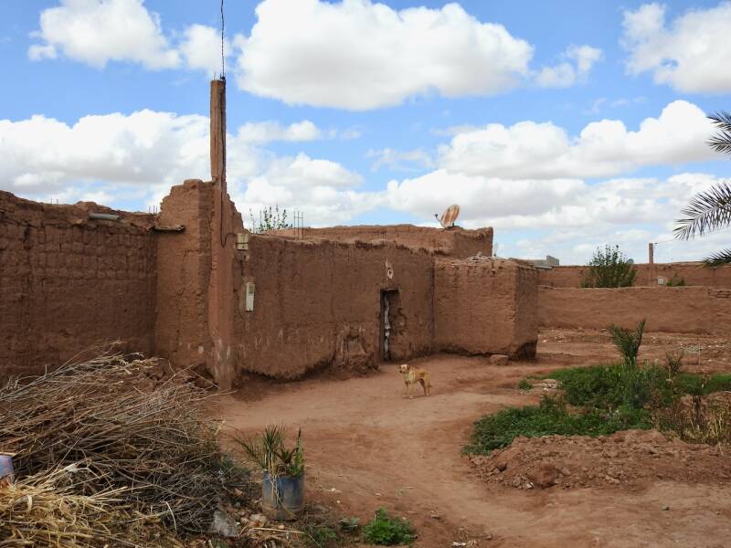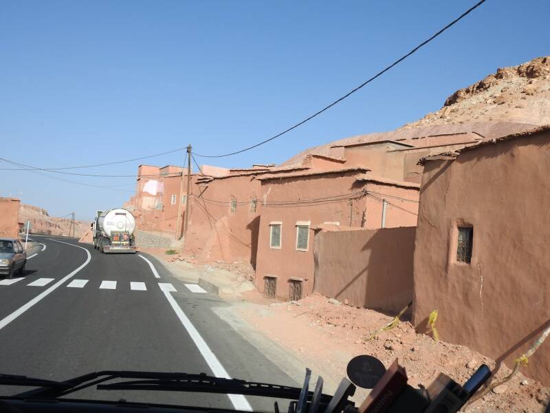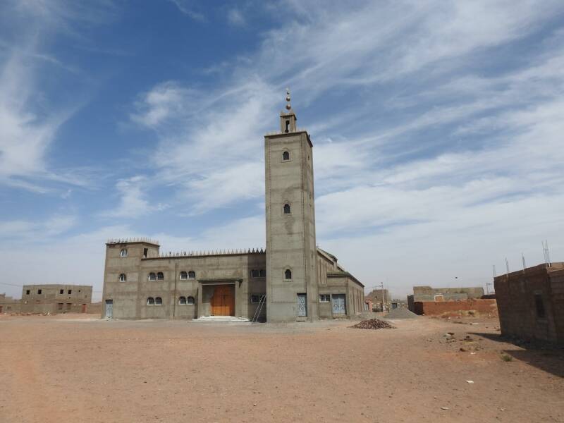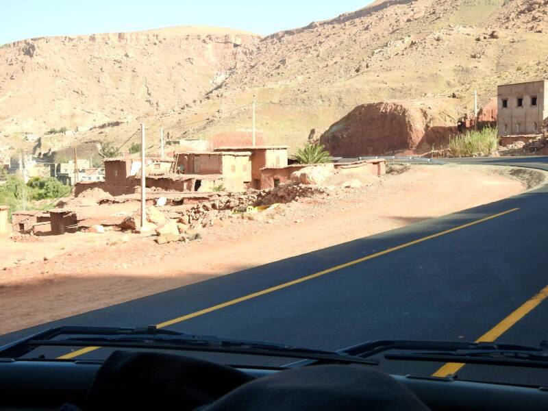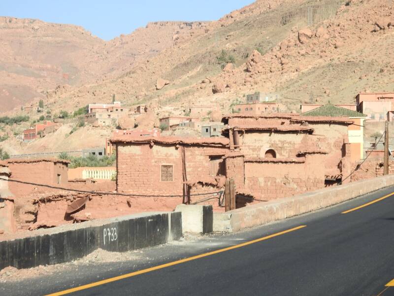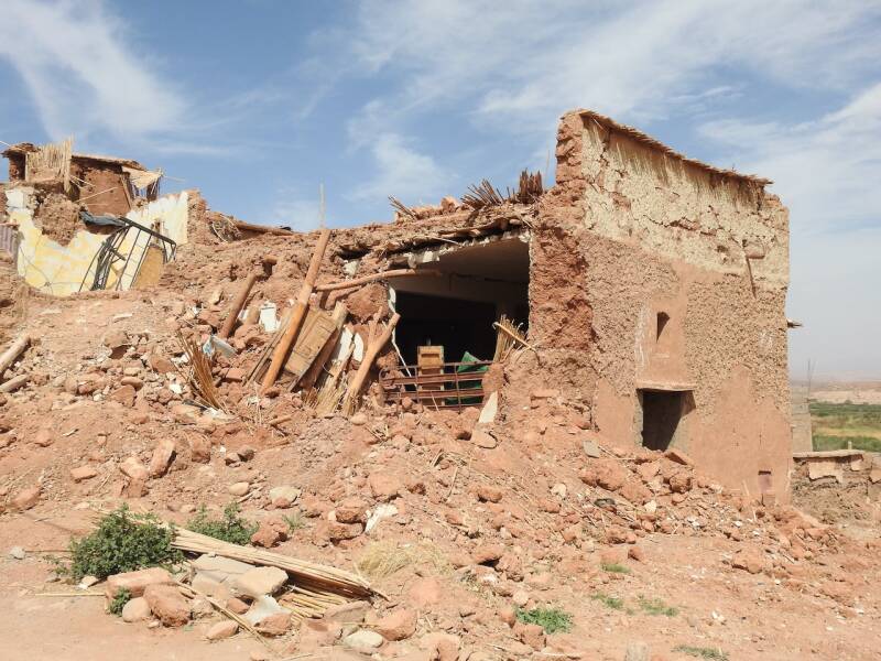 Ik heb vanmorgen alleen een fietstochtje gemaakt, Everdien ging niet mee omdat er eerst een klein stukje over de N9 moest worden gefietst waar ook vrachtwagens langs denderen. We zijn meerdere keren daarheen gewandeld maar vandaag gun ik mijn voet wat rust ivm de wandeling van gisteren. Tot mijn verbazing was het pad naar het dorp met zijn kasba waar we altijd naar toe wandelden nu helmaal geasfalteerd. En over het riviertje waar we altijd over stapstenen naar de overkant naar het dorp moesten komen, lag nu zowaar een brug, in het riviertje was alleen maar zand, water was er allang niet geweest. Het dorp Tikirt is getroffen door de aardbeving, hier zijn de 3 doden gevallen waar de campingbaas het gisterenavond over had. Ik ben hier niet naar toe gefietst als ramptoerist maar wilde naar de oude kasba waar ooievaars nestelen. De kasba kon ik niet vinden, misschien was die ingestort , ik voelde me te beschaamd om er naar te vragen, mede omdat er de nodige ingestorte huizen waren. Er werd ook flink gebouwd, met die gasbetonblokken gaat dat snel, er werd een nieuwe wijk de grond uitgestampt. Er stond zelfs al een grote moskee, onontbeerlijk natuurlijk in Marokko waar allah ook niet zo almachtig is dat hij een natuurramp kan voorkomen al hebben gelovigen daar een hele uitleg voor. Dit dorp heeft geluk met de wederopbouw omdat het goed bereikbaar is dankzij de vrij nieuwe asfaltweg. Voor dorpen in de Hoge Atlas die geïsoleerd liggen en slechts door ezelpaadjes bereikbaar zijn is het natuurlijk een heel ander verhaal. Ik ben door gefietst en voelde me toch niet prettig daar, niet door het gedrag van de paar inwoners die op straat waren, die waren vriendelijkmaar door de wetenschap dat er zich hier een kleine ramp heeft voltrokken met de aardbeving.