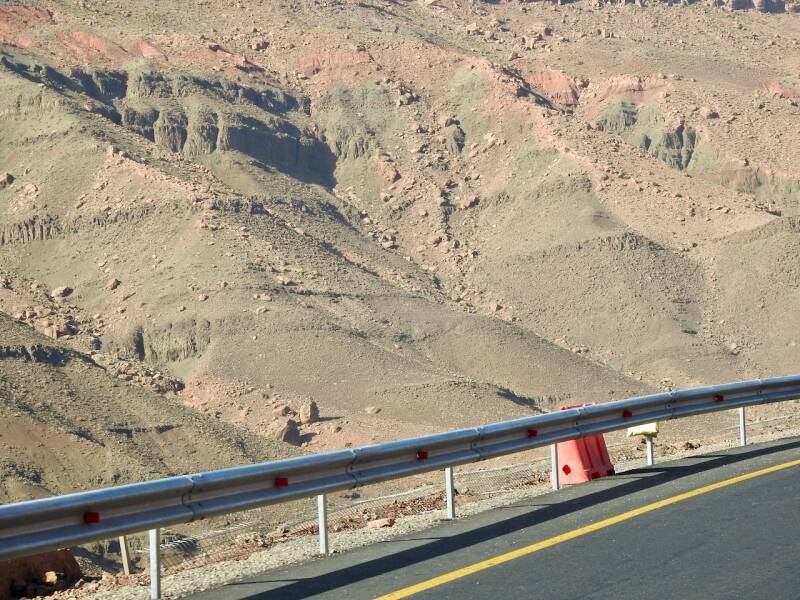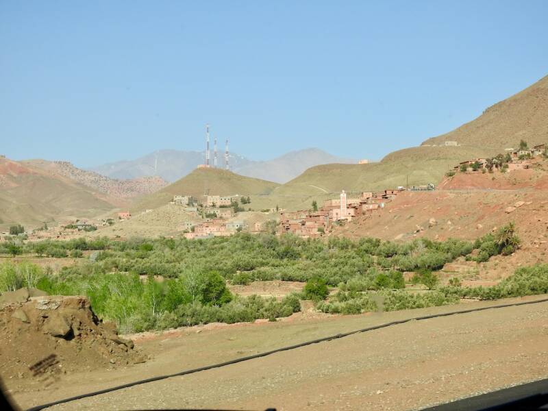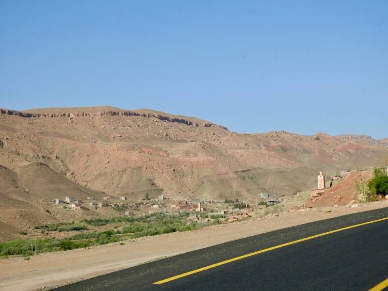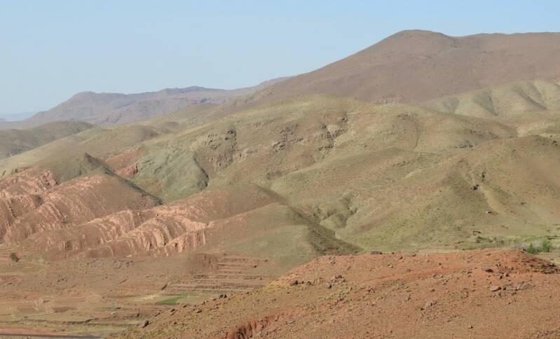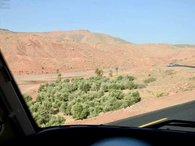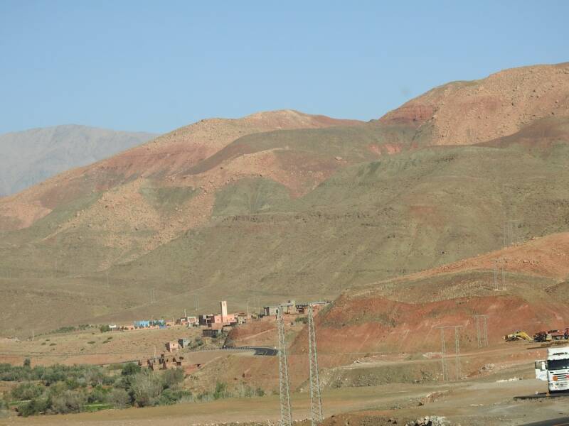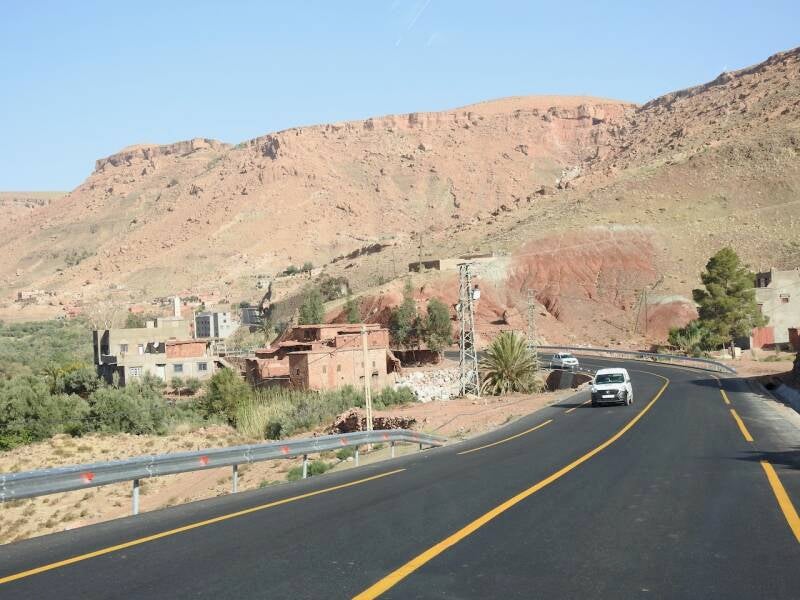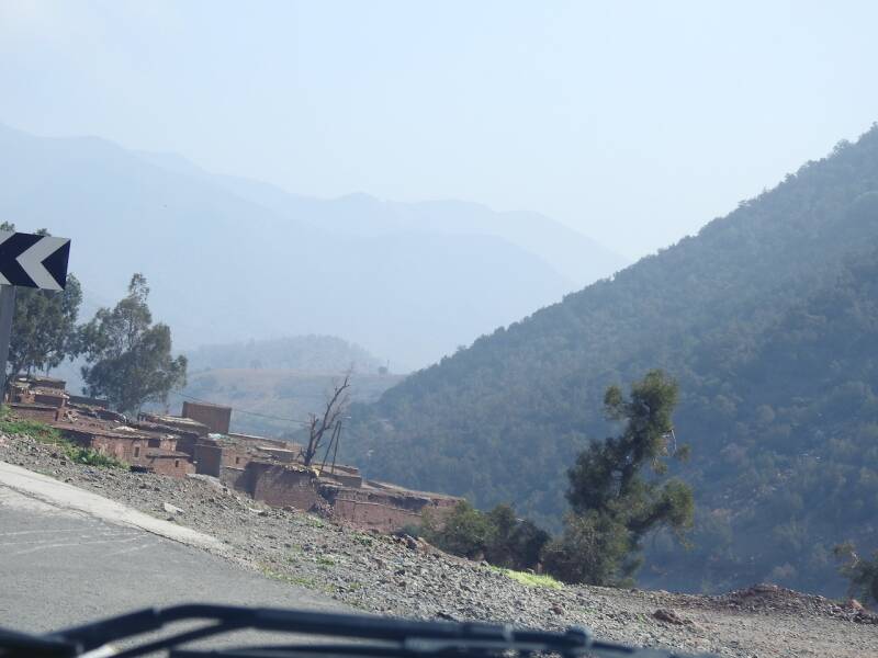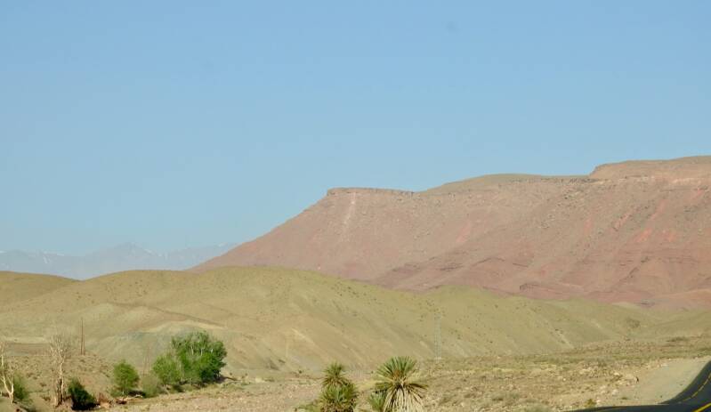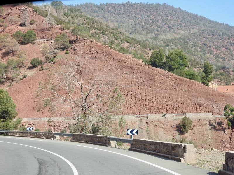 De route via de N9 is wat sneller, we hadden niet zo’n moeite om die beslissing te nemen. De weg is nu bijna helemaal klaar, ze zijn nog druk bezig om de laatste stukken te verbeteren, hij was prima te rijden zo. Er waren zelfs een paar panorama punten aan gelegd en delen waren zelfs met 3 banen. Niet zo avontuurlijk meer als vroeger toen de weg bochtig en smal was, maar voor mensen op leeftijd zoals wij, is dit wel zo prettig . Maar het landschap was er even schitterend om en nu kon ik ook wat meer om me heen koekeloeren. De bergen hadden allerlei kleuren, groen, donderrood, donkergrijs. We passeerden af en toe een dorpje en er waren akkertjes tussen de bomen, geen palmen maar andere bomen, het was aardig groen. Een tijdje nadat de de afdaling begonnen was, na het passeren van het hoogste punt van de Tiz-’n Tichka en de weg werd omgeleid omdat er door de aardbeving rotsblokken op de weg lagen, kwamen er plotseling laaghangende wolken de berghellingen af rollen over de weg en werd het niet alleen mistig maar begon het ook te motregenen. Weg mooie uitzichten en prachte kleuren, gelukkig hadden we dat allemaal al gehad.