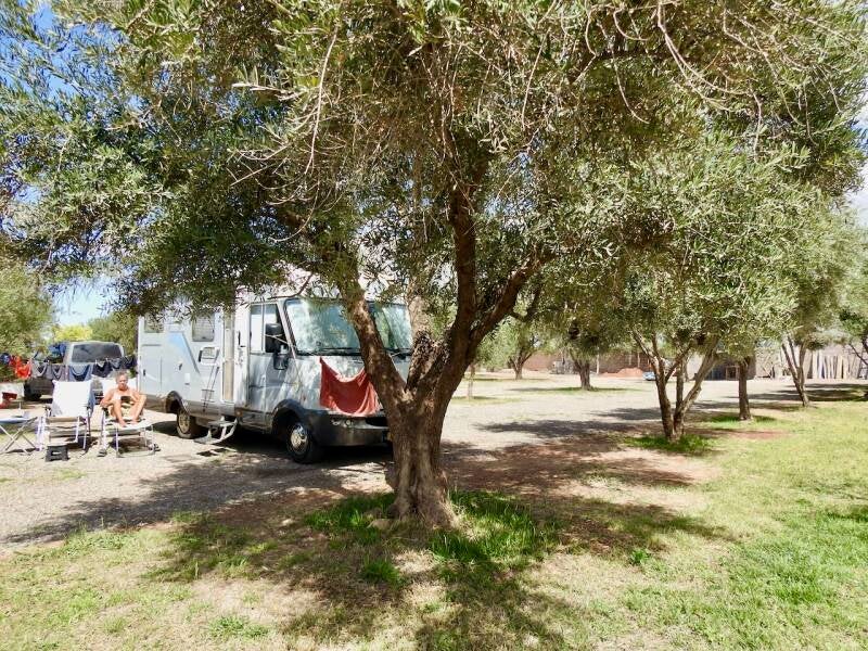 Ons doel was vandaag een rustig gelegen camping in opbouw tussen de olijfbomen , 20 km voor Marrakech. Dus niet bij de Koutoubia maar om mijn voet nog wat te ontzien na gisteren zijn we naar deze camping gegaan. Het is wat te makkelijk opgeschreven want om hier te komen moet je via een erg smal pad hier naartoe en in een dorpje wist men na navraag te vertellen dat we een nog smaller pad in moesten rijden. Uiteindelijk hebben we ons door een gehucht met een ezelpaadje gemanoeuvreerd en kwamen we voor een gesloten poort waar we moesten bellen waarna we inderdaad op de juiste plek waren en werden binnengelaten. Waarna we ons konden installeren onder olijvenbomen, de moeite was niet tevergeefs, het is hier mooi.