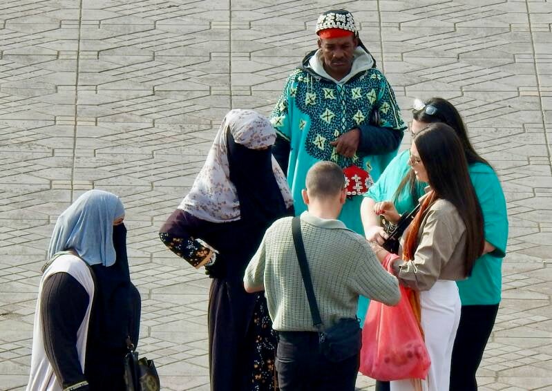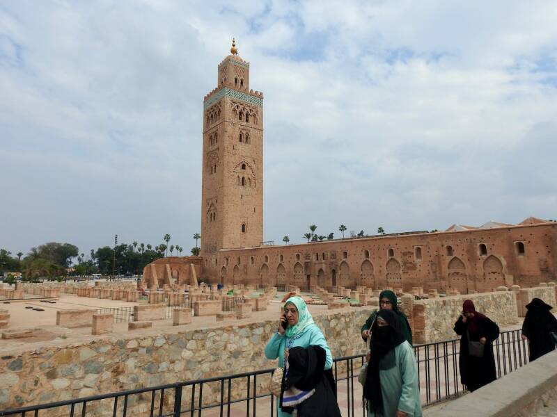 Vanaf de nu weer opengestelde Koutoubia moskee(voor moslims) na de beschadiging door de aardbeving, lopen we naar het Djema El Fna plein.