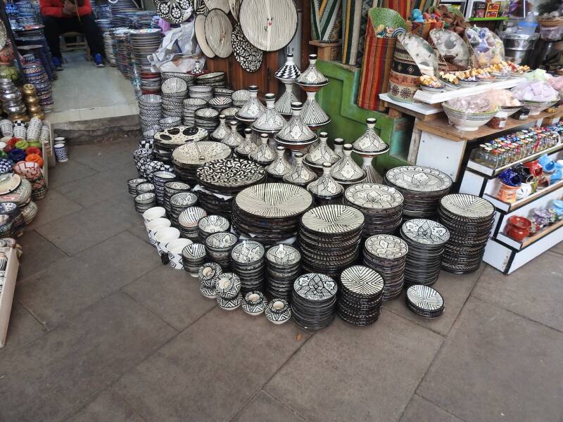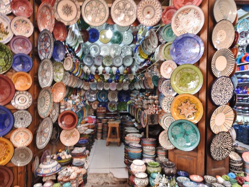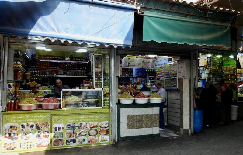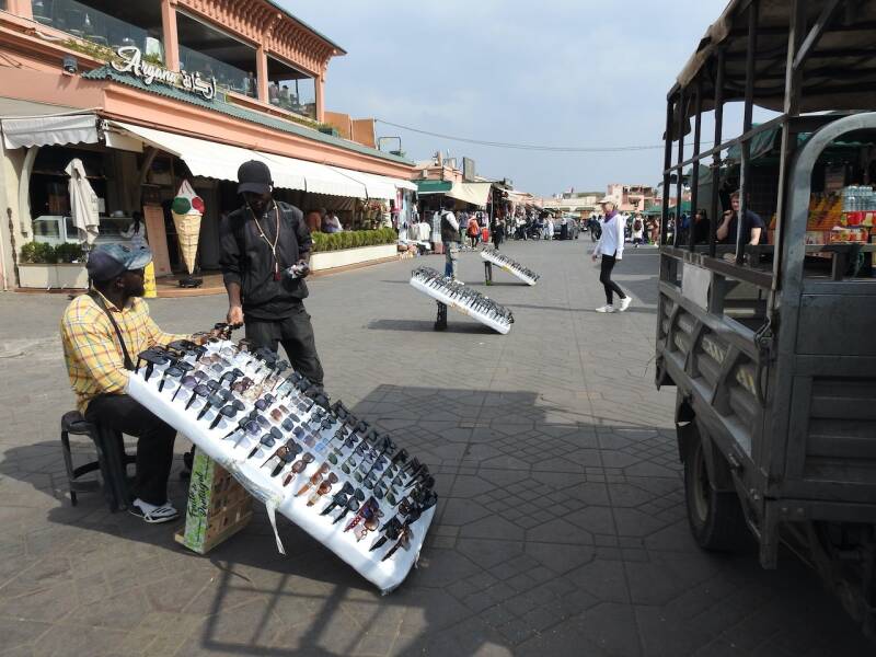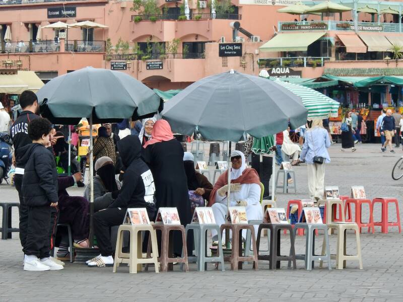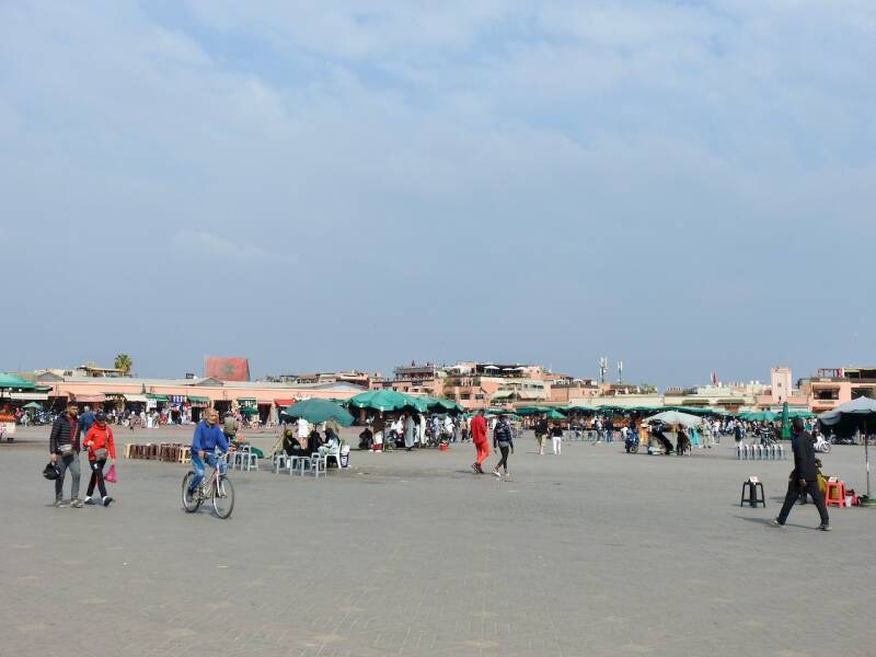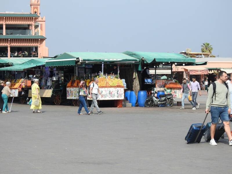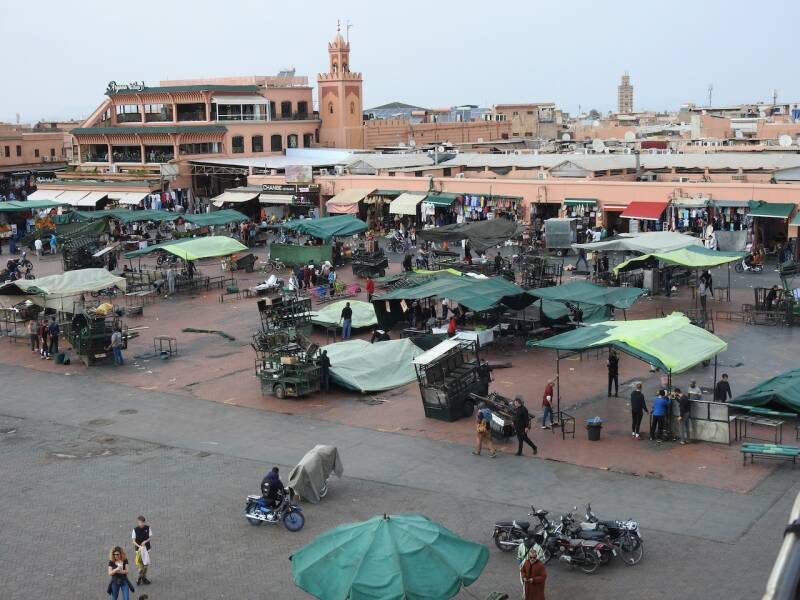 We hadden toen overigens eerst al een stukje door de souk gewandeld en ons vergaapt aan prullaria maar ook wel weer aardige dingen. Leuk om weer bekende hoekjes te zien, we hadden een fijne middag gehad was de conclusie toen we aan het begin van de avond een kop koffie dronken in de camper. Veel is er veranderd op en aan het plein vergeleken met de eerste keer toen we er waren in 1972. Toen was het een zandvlakte, de restaurantjes langs de kant waren kraampjes met zeildoek. Wat wel gebleven is zijn de eetstalletjes waarvan om stipt 17.00 uur de opbouw begon. Dat hebben we al vaak gezien, tegen zessen vonden we het tijd om naar de camper te gaan. En het weer was best aardig voor een stadsbezoek, zonnige perioden en weinig wind en 21º.