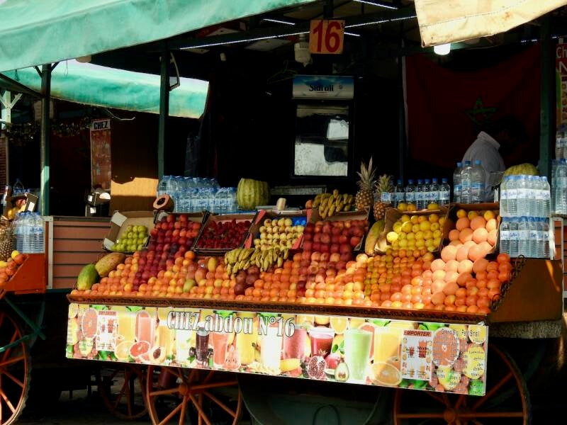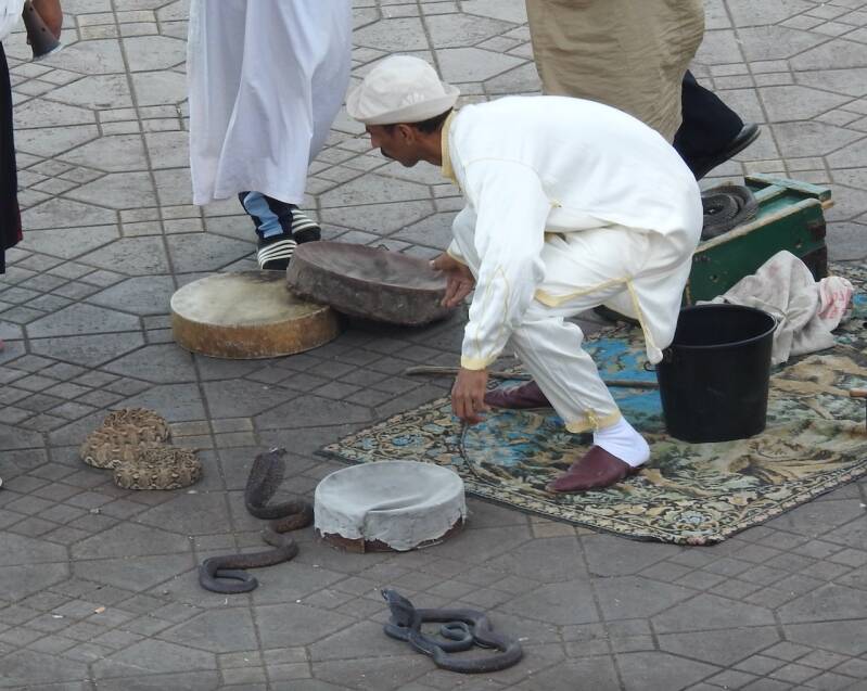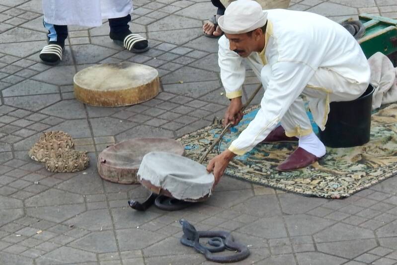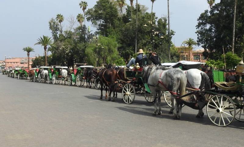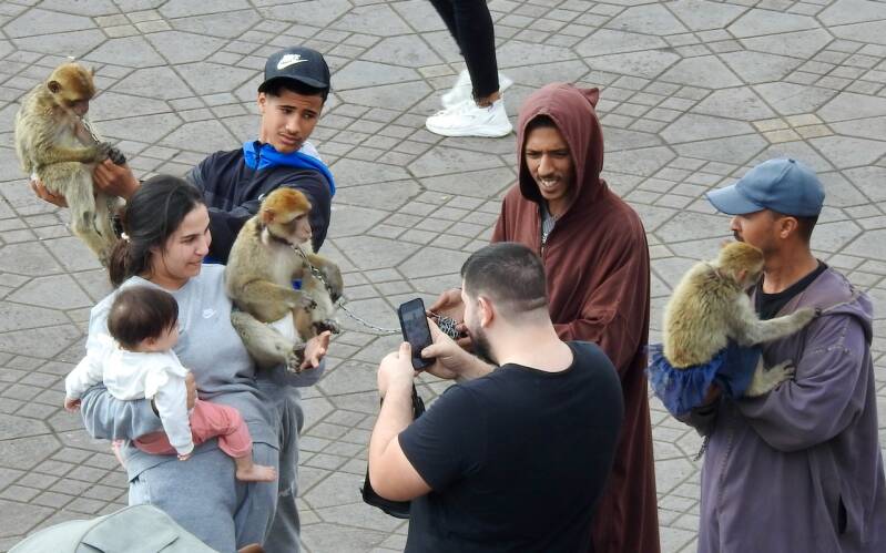 Na een kleine rustpauze zijn we naar het Djema el Fna plein gewandeld waar als vanouds op de route erheen allerlei verkopers met prullaria zaten, negroïde mensen uit de sub sahara hadden veelal zonnebrillen te koop. En ook de koetsjes stonden geduldig op klanten te wachten, althans de paarden waren geduldig maar zo’n 50 paarden verspreidden wel een doordringen poep- en vooral pislucht. Via het plein met langs de randen de sinaasappelstalletjes en verder verdeeld over het plein veel vrouwelijke henna tatoeëerders , 6 slangenbezweerders, een paar muzikanten en natuurlijk de aapjes die op schouders van vooral kinderen worden gezet. En iedereen probeert geld te verdienen, ook de café’s en restaurants langs het plein langs het plein. Bij een zo’n tent waar we vroeger met plezier zaten maar nu al door 2 knikkende en overdreven glimlachende mensen werden ontvangen en er zoveel personeel rondliep dat we dachten, die moeten allemaal betaald worden. Een glas jus d’orange kostte zoveel dat we onmiddellijk weer vertrokken en naar een etablissement gingen daar tegenover waar ze ook een dakterras hebben. Daar vroegen ze ook een fikse prijs voor 2 glazen jus , het dubbele van wat we elders betaalden nl. 50 Dh . We moesten vooraf betalen en toe we de jus d’orange kregen van bloedsinaasappels want het had een rode kleur, was het duidelijk met water aangelengd of met rode aanmaaklimonade. Maar we hadden wel een prachtig uitzicht over het plein en konden foto’s maken zonder dat er ons een uitgestrekte open hand tegemoet kwam.