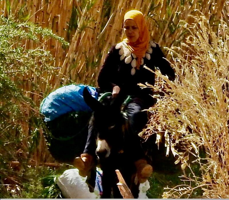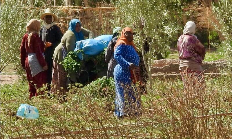 De grond is vruchtbaar langs het riviertje El Maleh, vrouwen oogsten groenvoer voor het vee zoals het altijd al gebeurt.