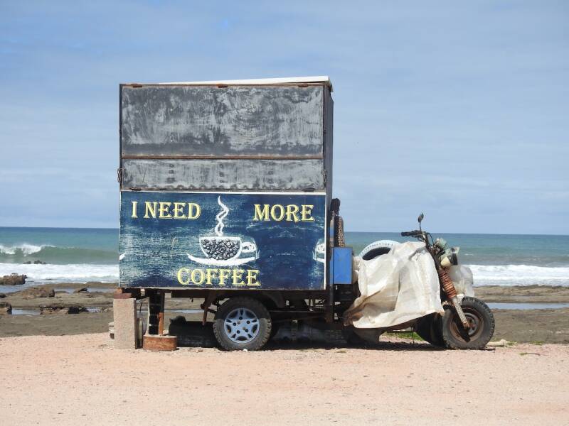 We zijn vanmorgen een kleinstukje langs zee gewandeld en toen naar de Carrefour winkel o.a. om blauwader kaas te kopen. We hebben de carrefour in Essaouira gemist, die blijkt er nog wel degelijk te zijn volgens Wim en Wobbie. Voor ons lag hij toen kennelijk verscholen achter de winkel van Atacadoa, we hebben in ieder geval kaas nu.