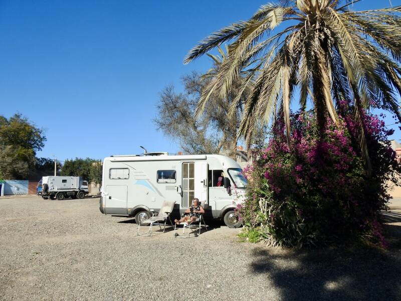 Gisterenavond kwamen er veel auto’ s vlakbij ons geparkeerd staan, we waren wel nieuwsgierig naar waar die mensen toch heen gingen . Dus maar eens even poolshoogte gaan nemen vanmorgen, er is een restaurantje behorend bij een tennisclub voor vrouwen. Daar mogen we van het toilet gebruik maken, er staat een bakje bij daar kun je 1 dirham indoen. Iets verder weg is een openbaar toilet, buiten zijn daar 2 kraantjes, volgens de garden kun je daar je cassette in legen. Overigens is de ingang van de tennisclub ’s avonds omlijst met rode ledlampjes, Marokkanen kun je af en toe wel een goede smaak ontzeggen, beter gezegd, ze hebben een andere smaak , houden van (nep)goud en bling bling. Dat zie je in de souks ook, gisteren nog een foto gemaakt van allerlei blinkend kitsch prullaria, niet geplaatst. Wel de foto van de knalroze en hard groene schapenvachten . Vooral de Berbersouk blonk(!) uit in bling bling en plastic. We zijn er naar toe gewandeld maar hij is wegens restauratie grotendeels afgesloten. Nu zitten handelaren met hun negotie rondom de souk, niet zo leuk.