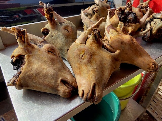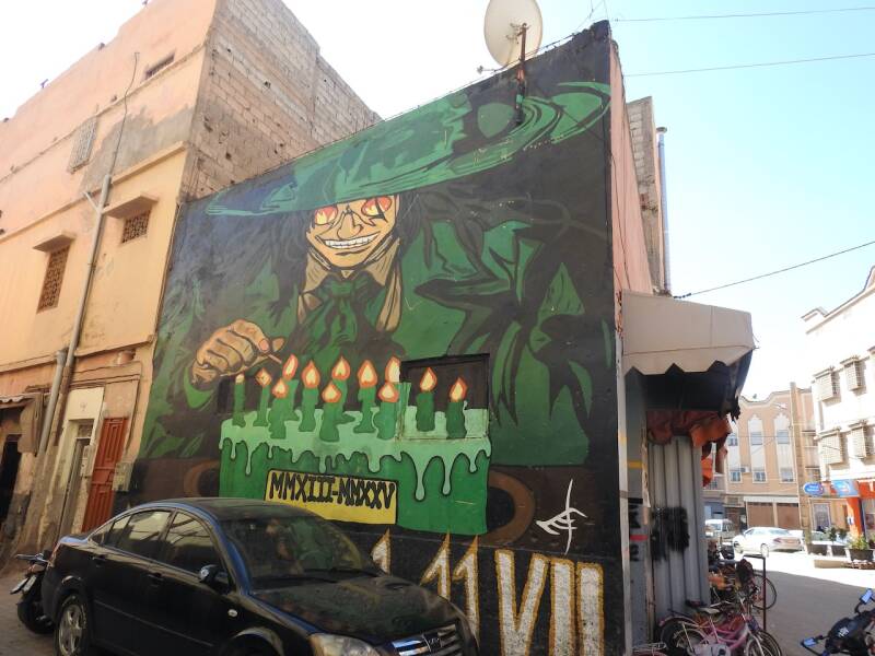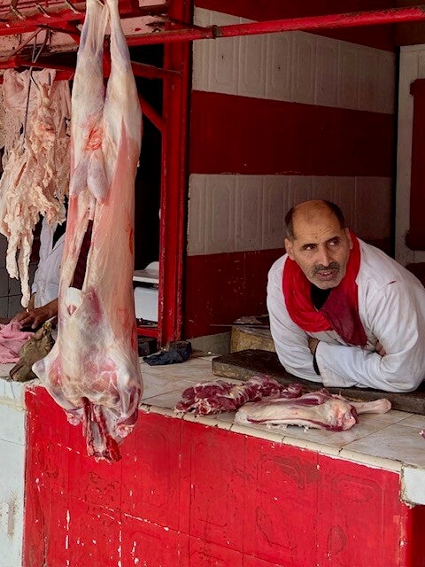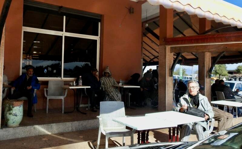 We hebben geluncht bij een soort snackbar, kalkoen brochettes met salade en frites. We vroegen er water bij, kregen een liter kraanwater, daar dreven vliesjes in, geef ons maar een afgesloten flesje. Een lichte smet op deze erg goed bezochte zaak met afhalers van maaltijden. Het eten was dan ook erg lekker en weer spotgoedkoop, weer 65 Mad, nog geen €6,50. Dan is het niet erg als je de handen wilt wassen en de zeep afwasmiddel blijkt te zijn.