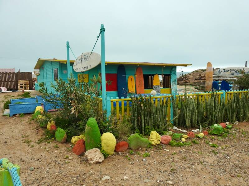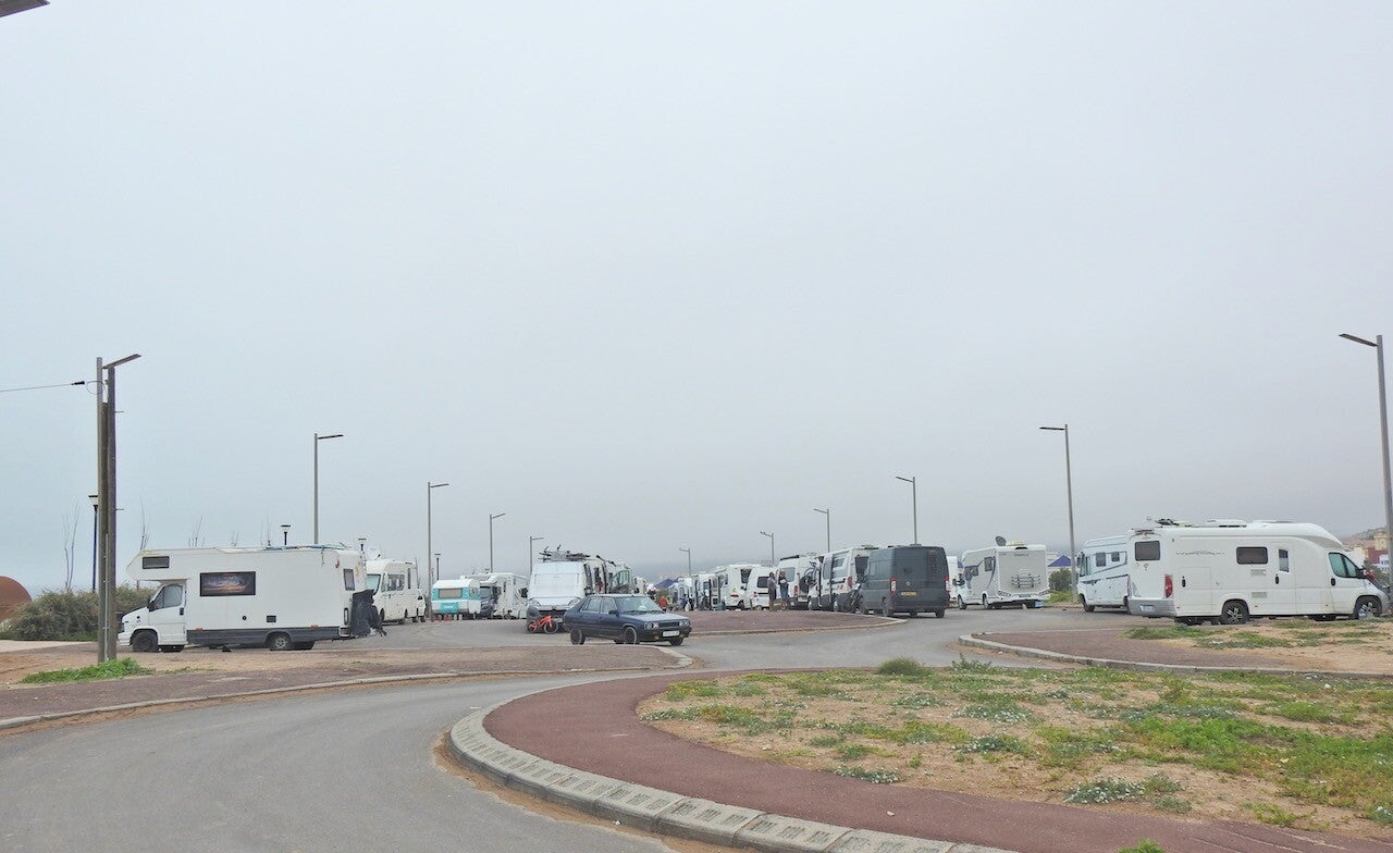 We hebben vanmiddag hier wat rondgewandeld, een leuke sfeer met al die jonge surfers. Gemixt met leeftijdsgenoten van ons natuurlijk die op de camping en parkings hier staan, er klonk een onvervalste Amsterdamse snauwerige opmerking . Er staan misschien wel meer dan 100 campers hier op de betaalde parkings, wij staan gelukkig rustig, met tot nu toe slechts 4 campers. De reusachtige camping Atlantica Imourane (450 plaatsen) schijnt ‘complet’ te zijn, het zijn onze buren, aan de andere kant van het pad. Marokko stroomt nog steeds vol met campers, we lazen in het verslag van Riet en Cis dat een paar dagen geleden camperaars bij Carlos nog buiten in de rij stonden voor tickets. Op het kleine stukje langs de kust van Agadir naar hier, zo’n 20 km , kwamen we veel campers tegen op weg naar het zuiden.