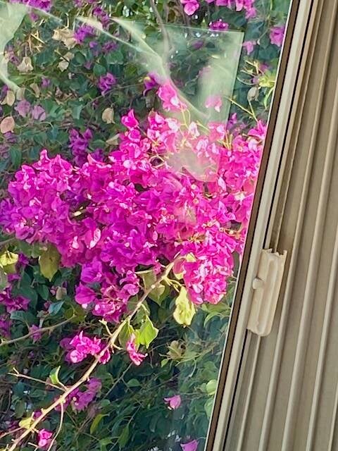 Het was een koude nacht, het was afgekoeld tot 4º buiten. Hadden we op ons plekje tot zonsondergang nog zon op de camper, toen de zon opkwam bleek dat we heel lang in de schaduw zouden staan, tot een uur of 12. Maar we staan hier zo mooi, kijk je uit het voorraam zie je de bougainville . In de camper was het 9,8º toen ik om 8.30 uur opstond. De parking is goed verlicht ’s avonds en ’s nachts en ook nog bewaakt, dat voelt veilig. Een goed alternatief voor de helaas verdwenen cp bij de poort, het is 10 min. verder lopen nu naar het centrum.