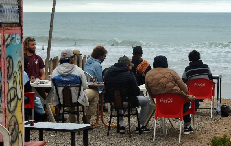 We zijn vanmorgen toch vertrokken, we hadden ons erop ingesteld om weg te gaan en het motregende. De ruitenwissers moesten aan: fijn hoor ,die deden het ook.! We zouden nu in Agadir langs de supermarkt Atacadoa gaan om wat wijn voor Trui te kopen, en meteen een flesje of wat voor ons zelf. We hadden kennelijk verkeerde coördinaten, kwamen op een merkwaardige plek, zouden 12 km terug moeten rijden volgens Google Maps, dat werd ons te gortig. We hadden het idee opgevat om naar de Duivelsrots in Tamraght (tussen Aourir en Taghazout) te gaan om daar te gaan staan. We hebben daar heel vaak gestaan, toen de voormalige camping waar we vrij stonden bij Taghazout, verboden werd om te staan vanwege de aanleg omdat er een luxe hotelcomplex werd gebouwd. Eerst hebben we boodschappen gedaan in Aourir, leuk om daar in het kleine centrum even rond te lopen, levendig en best authentiek. Daarna zijn we nieuwsgierig naar de Duivelsrots gereden. Dat was schrikken in die zin dat we erg veel campers zagen staan en dat het vrij staan nog op maar een klein stukje mogelijk was waar campers sardines-in-een blikje gewijze boven op elkaar stonden. Dan was er nog een ander stuk waar je moest betalen, net zo druk. We zagen een parking dichter bij zee en voor 50 Mad ( * ) staan we prima en we hebben nog een stukje zeezicht ook. We staan bij wat surfshops waar ze ook flodderjurken ( volgens Everdien) verkopen en nog geen 50 m van zee vlakbij de Duivelsrots , waar de surfers hun best doen een goede golf te pakken. Langs de zeerand staan nog steeds de nodige restaurantjes, net nu we hebben besloten om zelf weer eens te koken.