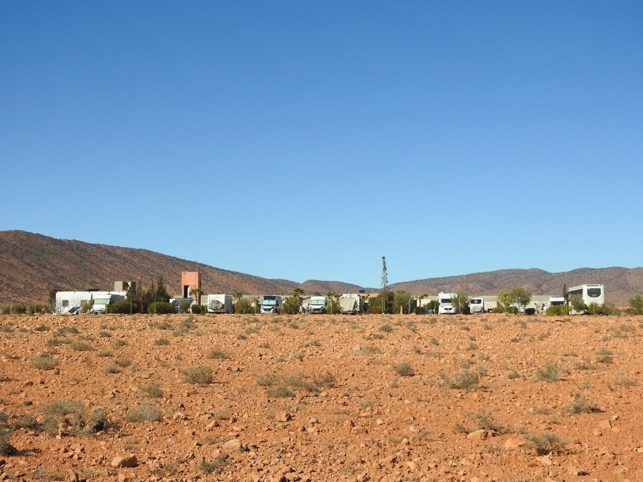 In Tafraout een plek gezocht waar we zon hebben, voor de panelen, ook ’s morgens vroeg op de voorruit en we tv ontvangst hebben. En we denken dat we gunstig staan als de wind toeneemt, bv morgen. Het camperen is nog niet zo eenvoudig.