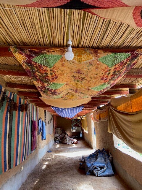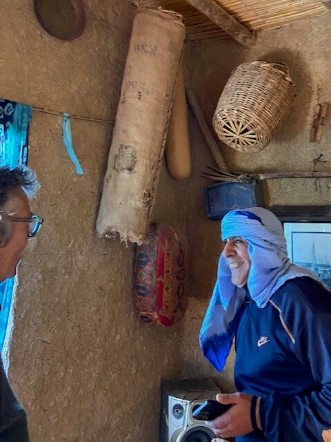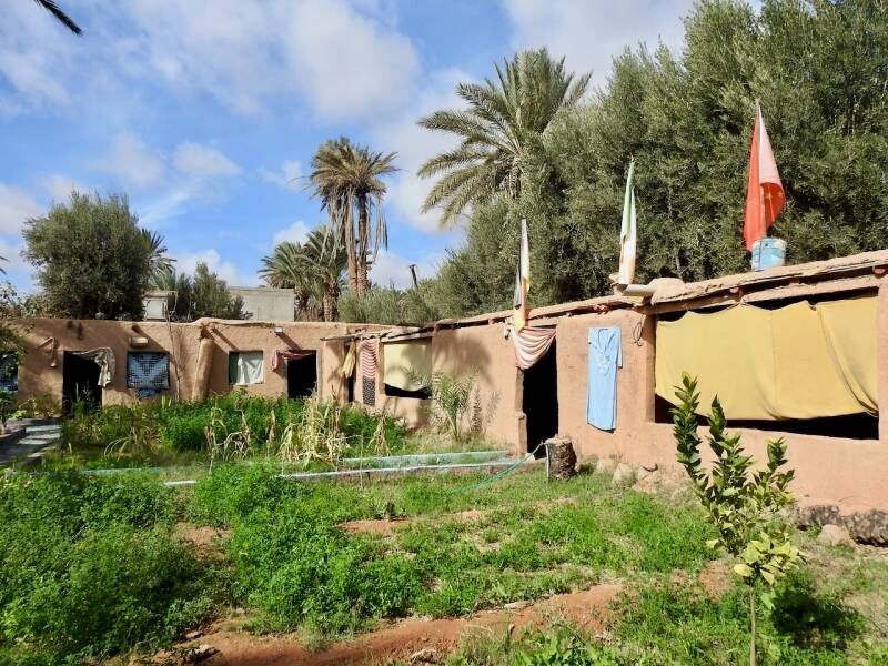 Toen we ons vanmiddag wilden laten inschrijven zagen we niemand maar het bleek dat de hele familie lag te slapen, 2 mensen achter de ‘receptiebalie annex bar en Lahcen himself in het restaurant, Everdien zag een kopje tussen de stapels dekens op de kussens langs de muur omhoog komen. Een heerlijke gemoedelijke sfeer heerst hier.