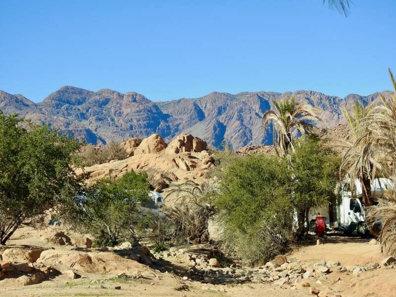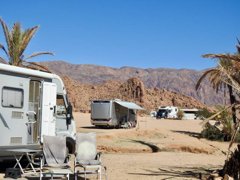 Een 500m piste over en we staan op de kleine familiecamping omringd door bergen van de Anti Atlas , van de hele aardige beheerder Lahcen. We kennen Lahcen nog uit 2010 toen hij gardien was op de vervallen camping municipale midden in het dorp. Niet lang daarna is hij een camping 2 km buiten het dorp gaan opzetten, de andere camping was toen gesloten.