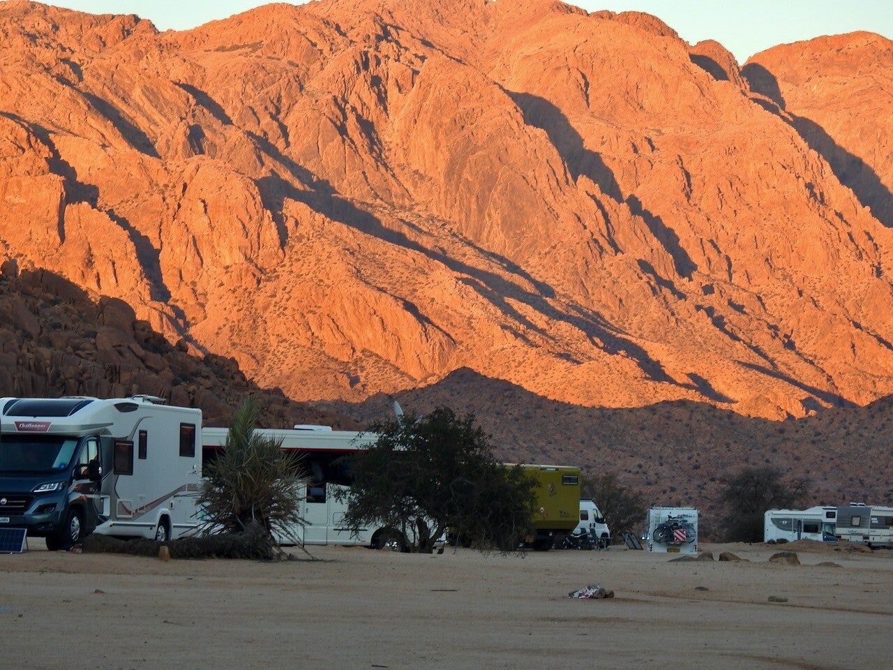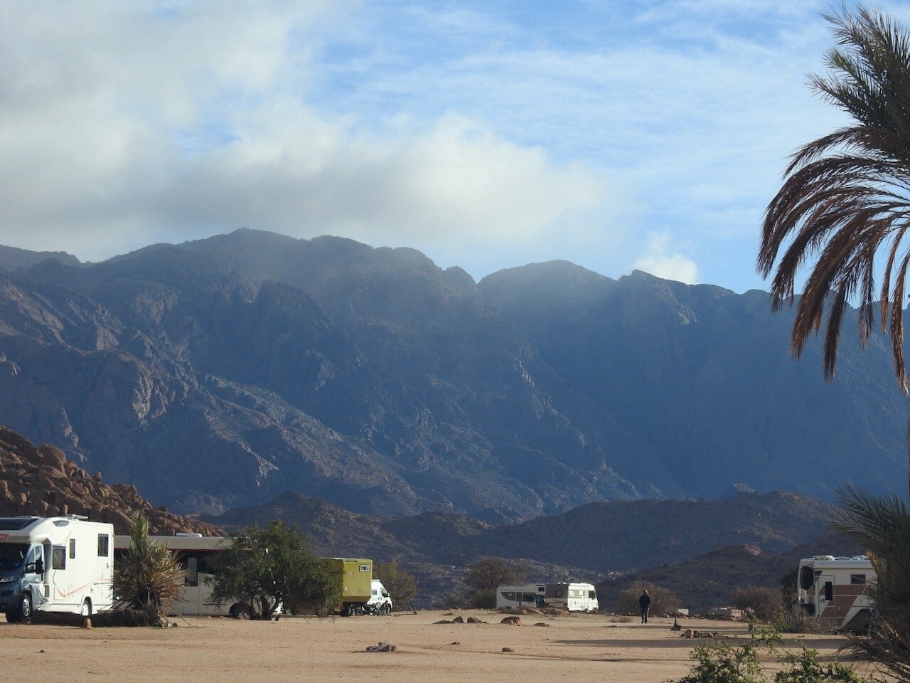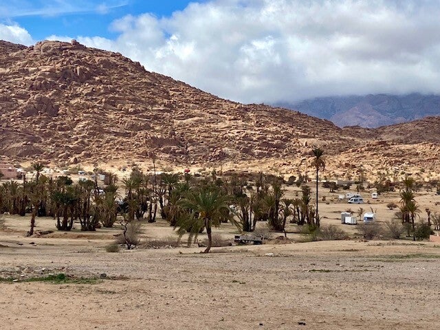 We waren van plan om te vertrekken vanwege de weeromslag en dan naar Icht te gaan. Bij nadere bestudering van het weer op de diverse apps bleek dat ik òf ’s ochtends de windverwachting niet gezien had òf dat de windverwachtingen waren bijgesteld. Een paar dagen harde wind in Icht, daar hebben we ervaring mee, het stuift dan ontzettend. Dus gaan niet 110 km oostelijk maar een kleine 60 km in zuid westelijke richting , nl naar een oase bij Guelmim in de buurt. We verwachten daar wat beschutter te staan tegen de wind en het is al wat jaren geleden dat we daar in een van die oases waren. We lazen in een bericht van Jan E dat daar op een nieuwe camping, voldoende plaats was, althans gisteren. Hoewel Everdien had gezegd ik ga absoluut niet zuidelijker dan Tafraout , is ze het helemaal eens met deze beslissing. Niet dat ze altijd zo gewillig is maar ze luistert wel naar argumenten gelukkig, dat scheelt weer in de sfeer. Tafraout is nog geen optie op dit moment, weerapps spreken zich ook vanochtend nog tegen over de gevolgen van de weeromslag daar. Zoals het er nu naar uitzet gaan we daar ws zondag heen om in ieder geval minstens 2 weken daar dan te blijven. We zullen daar de nodige bekenden zien, o.a. het Avondrood + clubje zal elkaar daar dan treffen.