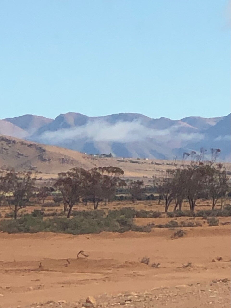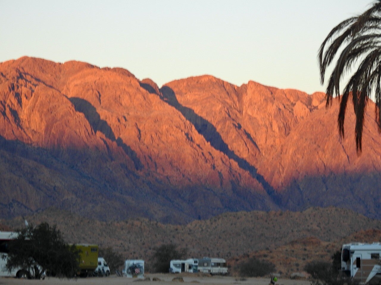 De zon verlichtte gisterenavond nog even mooi de bergen achter de camper toen hij rond 19.15 uur was ondergegaan.Gisterenavond nam die wind snel af, vanmorgen was het windstil zodat er opnieuw mist was ontstaan maar hier alleen in de verte als een witte slinger tegen de bergen aan tegen de opkomende zon in, met de zon mee zag de mist er wat donker uit, zie de foto’s. De mist loste door de krachtig schijnende zon in de loop van de ochtend op. De zon komt op om 8.32 en om 8.35 scheen hij door het camperraam, kon hij mooi de camper opwarmen, de kachel hadden we aangehad in de laagste stand.