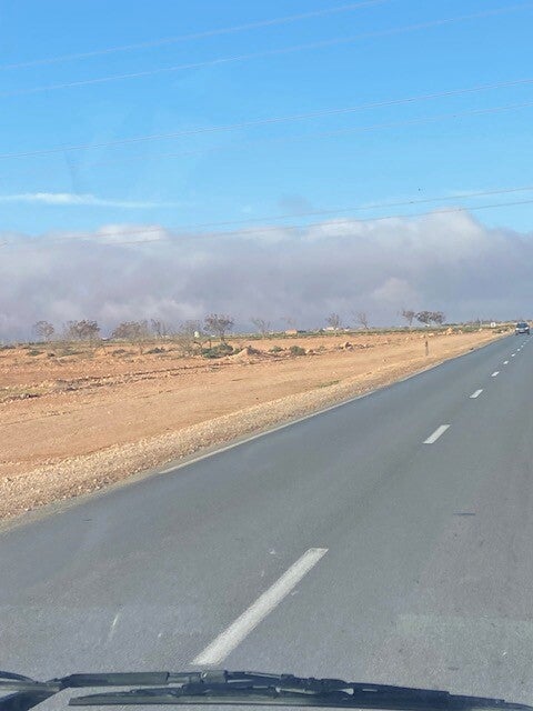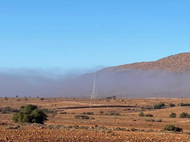 Goed gemutst ,want lekker geslapen, gingen we op pad, er was zowaar een nieuwe weg van Tiznit naar Guelmim , een hele mooie 4 baans weg, tolvrij. Er hing al wat mist in de bergen en helaas werd het hoe langer hoe mistiger, het mooie landschap zodoende aan ons oog onttrokken.. We konden naar Guelmim via de nieuwe weg en dan terug naar Bouzikarne , dat zou een omweg zijn. Maar er was ook een verbindingsweg naar de NI, dat is een stuk korter, die kozen we. Het was nog geen 15 km naar de NI, gelukkig asfalt zei Everdien maar toen we een dorp gepasseerd waren werd het piste. Toen was het nog maar een km of 5 naar de NI, maar de mist was dichter geworden en dan zijn er nog idioten die opdoemen op de piste en je zonder licht tegemoet rijden. Op 2 plaatsen was een omleiding, de weg was weggeslagen, we moesten door grote kuilen met water waarvan je je afvroeg hoe diep die waren, maar het ging goed, modder kun je er afwassen.