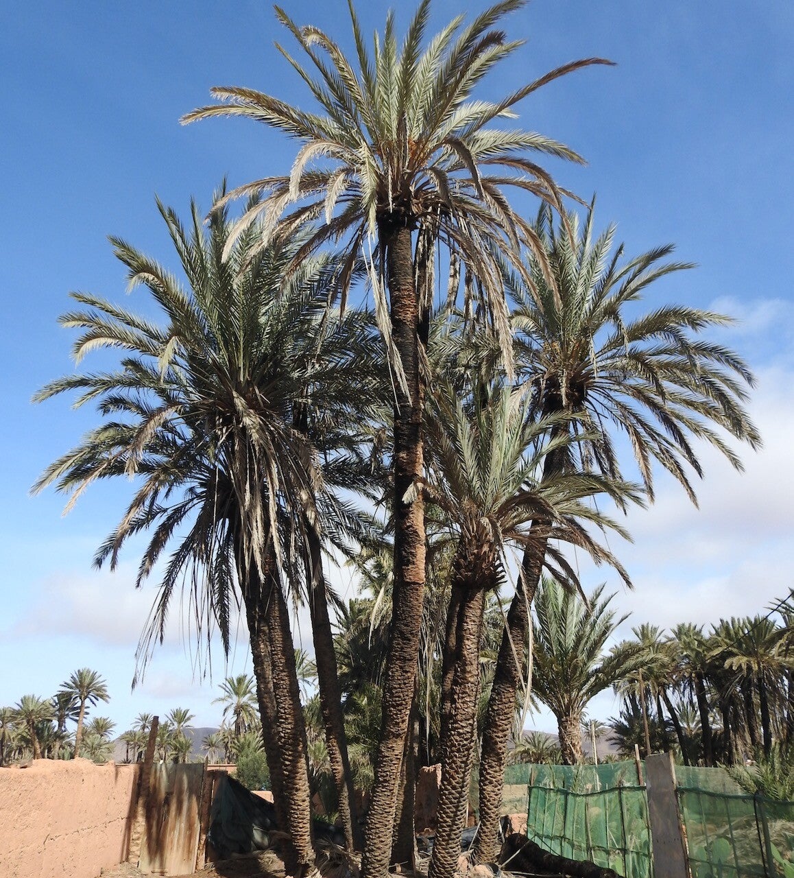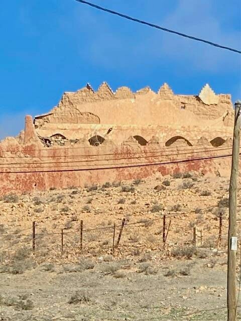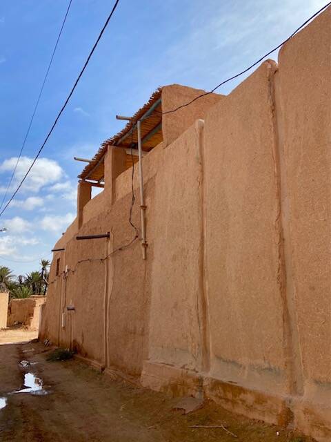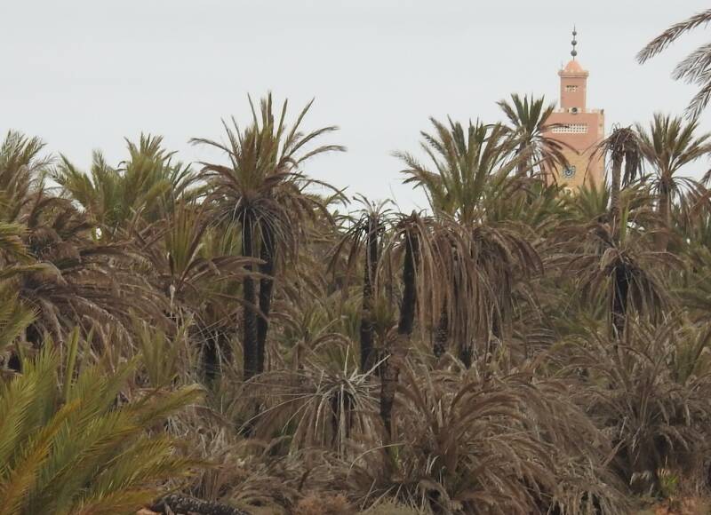 Bij onze wandeling gisteren zagen we al de schade die een enorme brand in aug. 2020 heeft veroorzaakt, ws veroorzaakt door de extreem hoge temperatuur van 47º. De brand duurde verscheidene uren en verwoeste veel palmbomen. Nu is het zo dat deze palmen niet dood zijn gegaan, alleen de bast eromheen is verbrand, de kern is blijven leven. Het is een beetje bizar om een verkoolde stam te zien terwijl de kroon van palmbladeren gewoon groen is. Er staan hier nog wel dadelpalmen maar de dadels zijn aan de kleine kant, na de brand groeien ze wel weer sinds vorig jaar te klein. Zoals overal op het platteland zijn jongeren naar grote steden getrokken, of om te studeren, of om te werken. Het harde boerenbestaan, met al zijn onzekerheden qua inkomsten trekt hun niet.