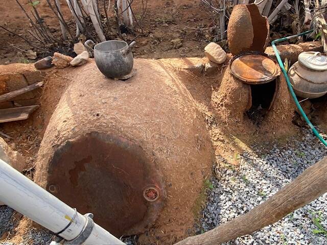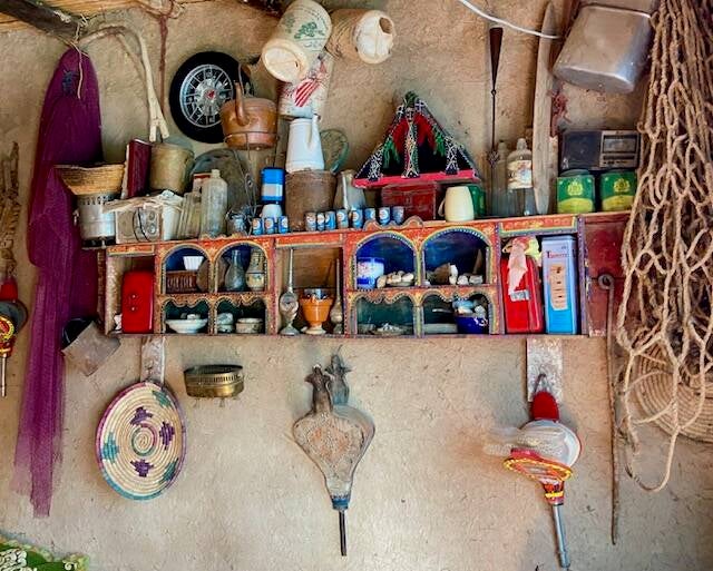Toen we vanmorgen door een dorp in de palmentuin liepen , zagen we pas goed dat er heel veel bomen brandschade hadden. De meesten hadden het overleefd een kleiner aantal niet. We raakten in gesprek met Habib, een kok die op Lanzarote werkt. Hij nodigde ons uit om thee te drinken in zijn huis, een klein paradijsje. Een mooie binnentuin met wat oude gebruiksvoorwerpen, rondom is zijn huis gebouwd. Een van de kamers leek wel een klein museumpje met allerlei herinneringen aan zijn vader en zijn jeugd die langs de muren stonden of hingen. We hebben thee gedronken en gekletst, hij praatte Frans, Engels en natuurlijk Spaans vanwege zijn werk. Hij vertelde dat de brand ook huizen had verwoest, ook een deel van zijn huis. Een hele aardige goedlachse man, de thee was gelukkig niet zo sterk. De huizen in het dorp hebben meestal pisé muren, Deze muren worden gebouwd door lagen aarde, klei en stro in een houten bekisting te stampen tot ze keihard zijn. Vroeger werd er ook wel stalmest doorheen gedaan. Het zijn dikke muren, goed tegen warmte en kou.