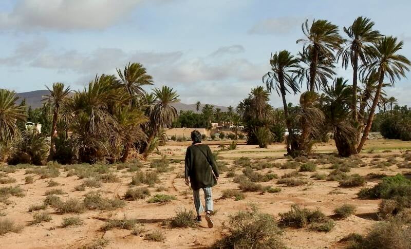 We lopen naar het dorp in de palmeraie die getroffen is door een brand in de palmbomen