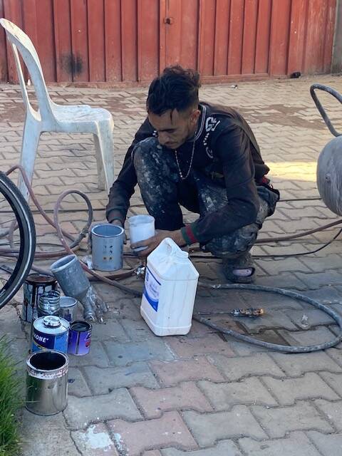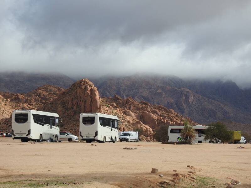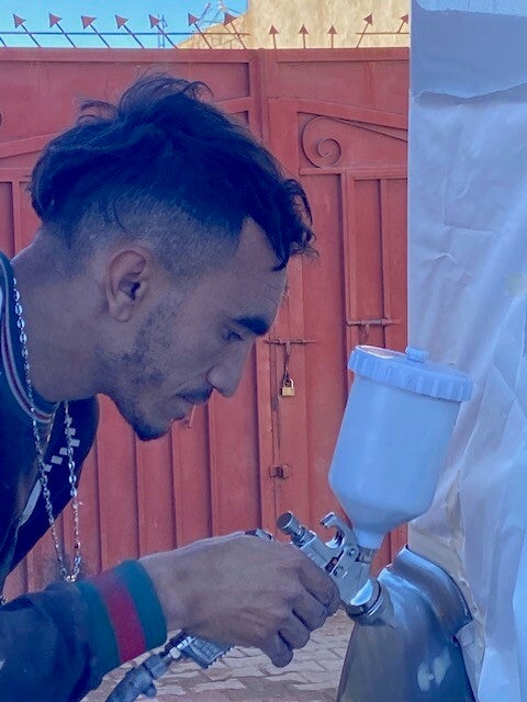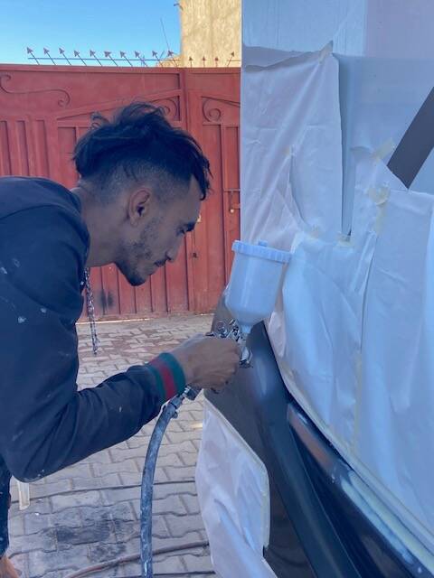 Er stonden trouwens nog meer campers bij Mohammed dan gisteren, een stuk of 17. Nu is Tafraout bekend vanwege het feit dat men hier goed is in het overspuiten van campers of het repareren van plaat- of plastic schade aan campers. Er zitten hier zeker 3 bedrijven, goed voor de concurrentie. De meeste camperaars gingen altijd naar Mohammed, sinds enkele jaren heb je ook de spuiterij van Little Mo, die is in het dal en heeft een heuse spuitcabine en er is een minicamping bij voor als je moet wachten. Je hebt nu a.h.w. 2 kampen met believers, òf Little Mo is beter , òf Mohammed. Wij komen al jaren bij Mohammed en van beide hoor je verhalen hoe goed of hoe slecht werk er geleverd wordt.