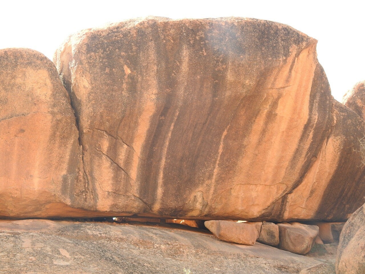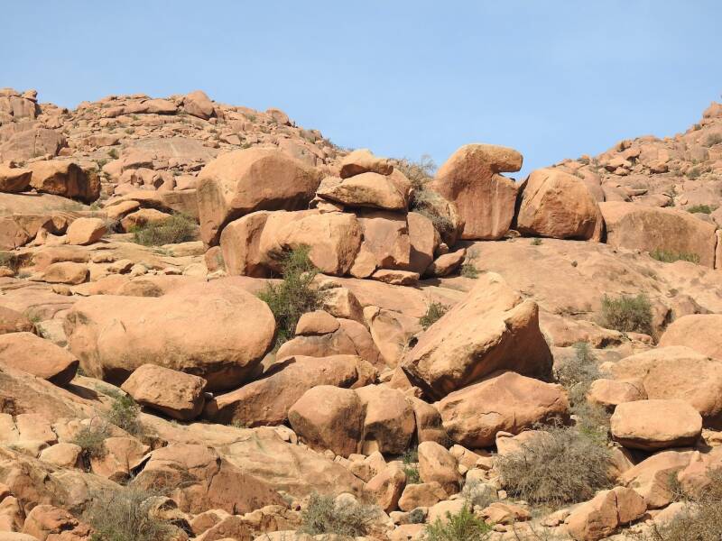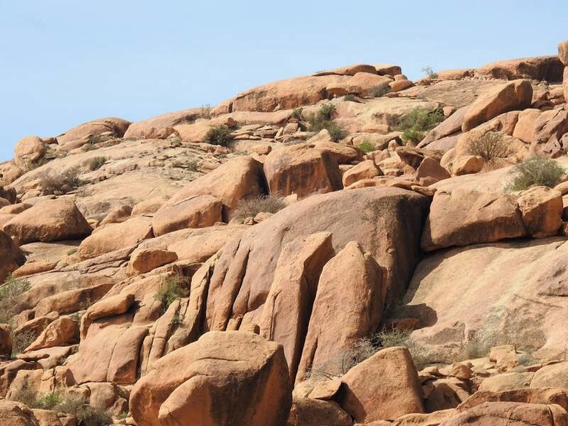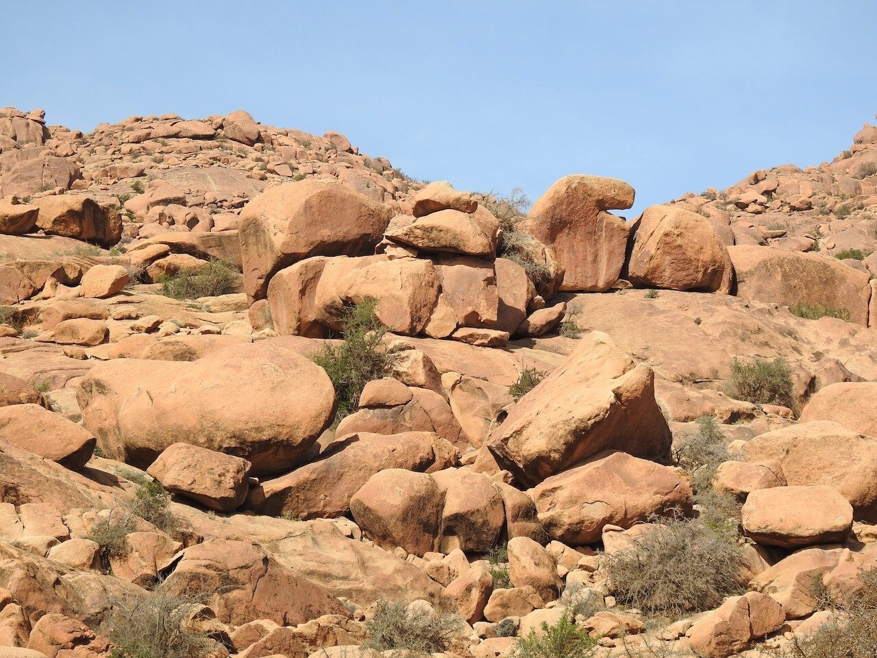 De rotsen rondom Tafraout bestaan hoofdzakelijk uit graniet, vandaar ook de mooie kleuren als de zon erop schijnt. In het kort komt het erop neer dat het keteldal ontstaan is door een combinatie van erosie en verwering van het granietgesteente. Graniet is een hard stollingsgesteente wat miljoenen jaren geleden diep in de aardkorst is ontstaan. In dat graniet zijn door o.a. afkoeling scheuren ontstaan, dat zijn zwakke plekken. In een proces wat miljoenen jaren geduurd heeft zijn door grote temperatuurverschillen tussen dag en nacht, wind en sporadische hevige regenval , die scheuren, de zwakke plekken, breder geworden. Los materiaal spoelde weg, er zat ook zandsteen tussen het graniet, sommige delen van het graniet werden daardoor sneller uitgehold dan andere. Zo is er een komvormig of zgn keteldal ontstaan tussen de ronde granietformaties . Rond omdat graniet verweert in die vorm, de zgn. bolverwering. Daardoor krijg je ook die kenmerkende afgeronde rotsblokken , die hier nog her en der verspreid liggen, vaak kolossale ‘stenen’ zo groot als huizen, op de bodem van de kom. En zie je hier prachtige vormen zoals bv de hoed van Napoleon, iets buiten Tafraout. En nu maar hopen dat er niemand is die deze uitleg afschiet.