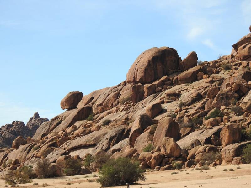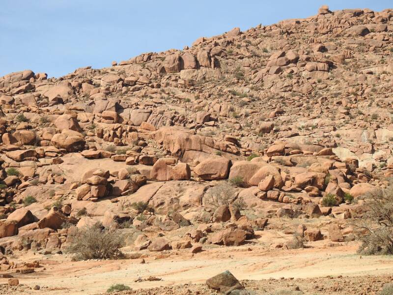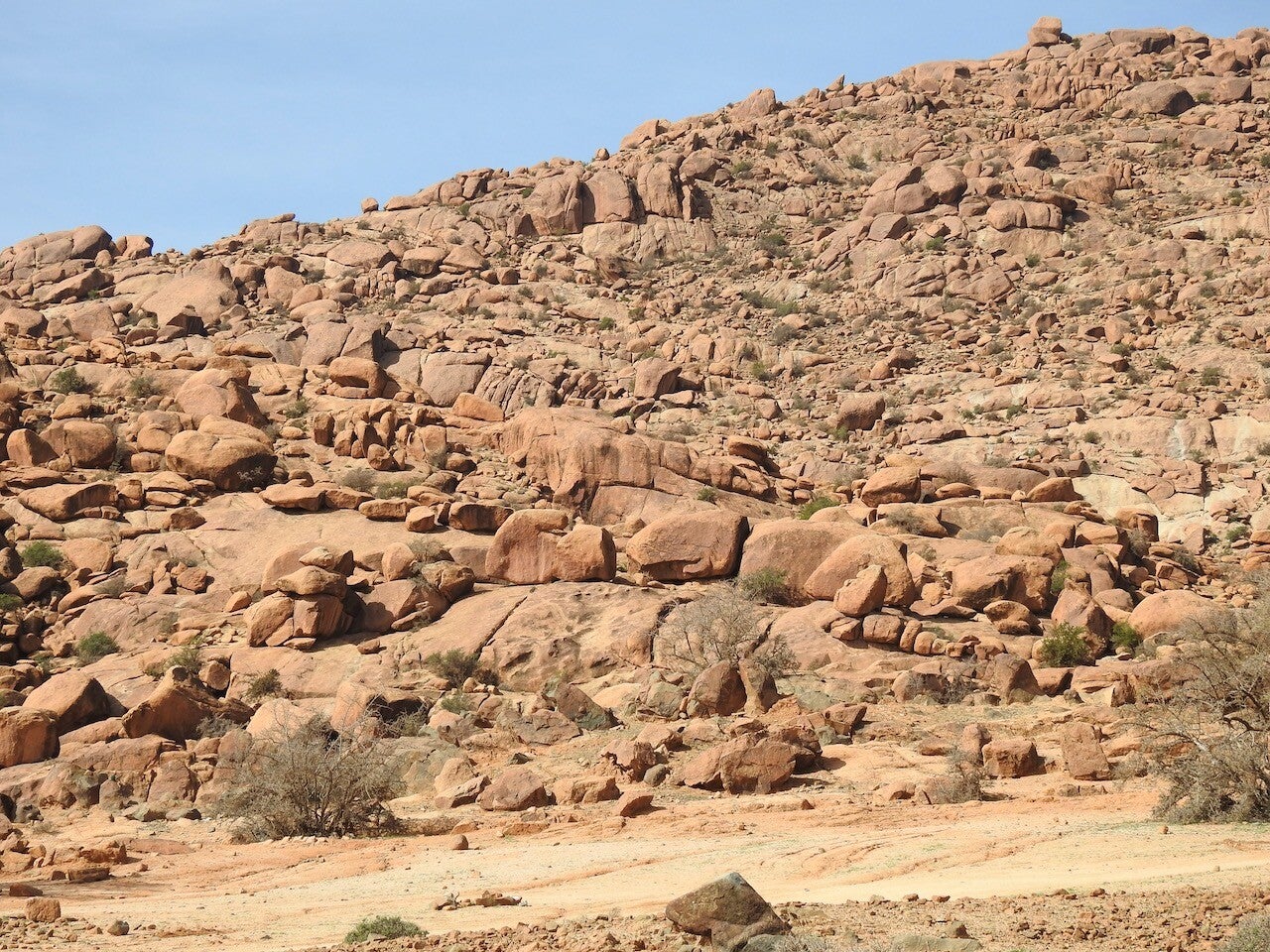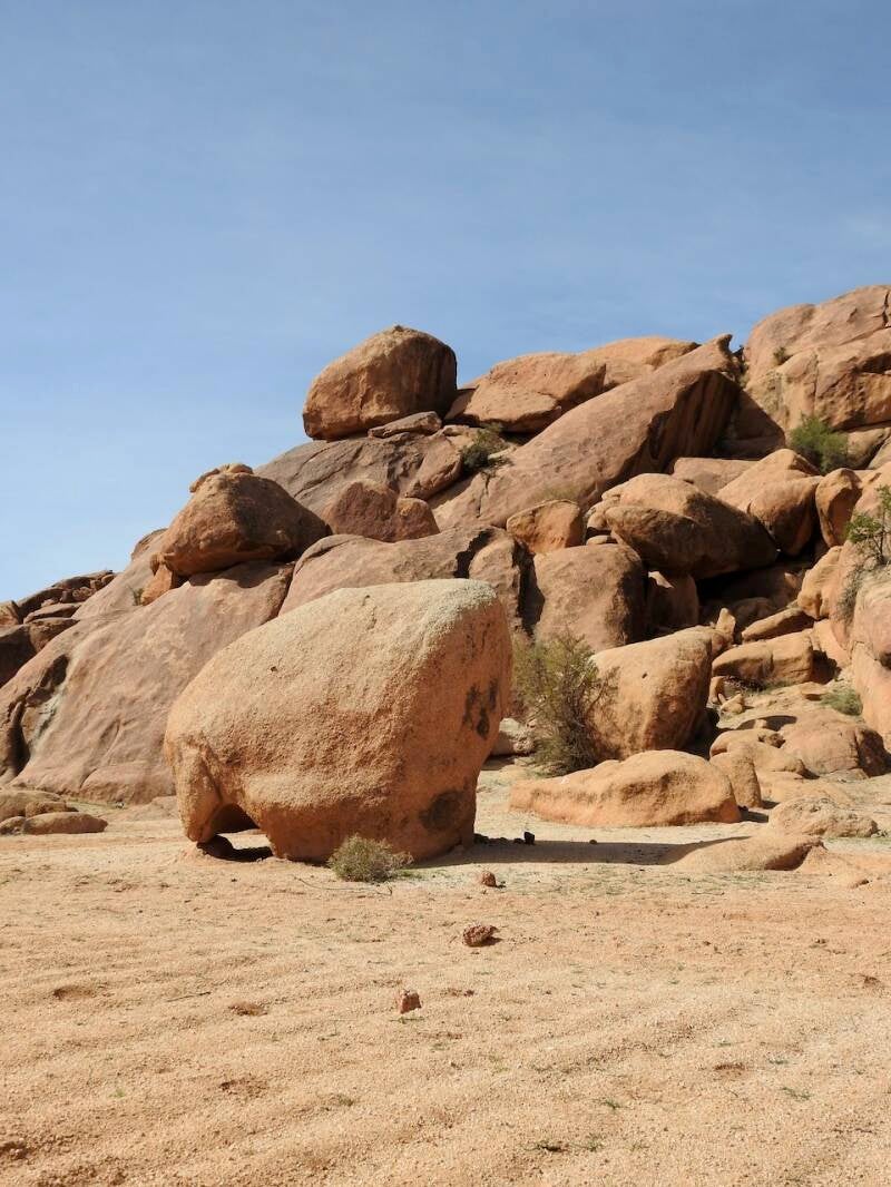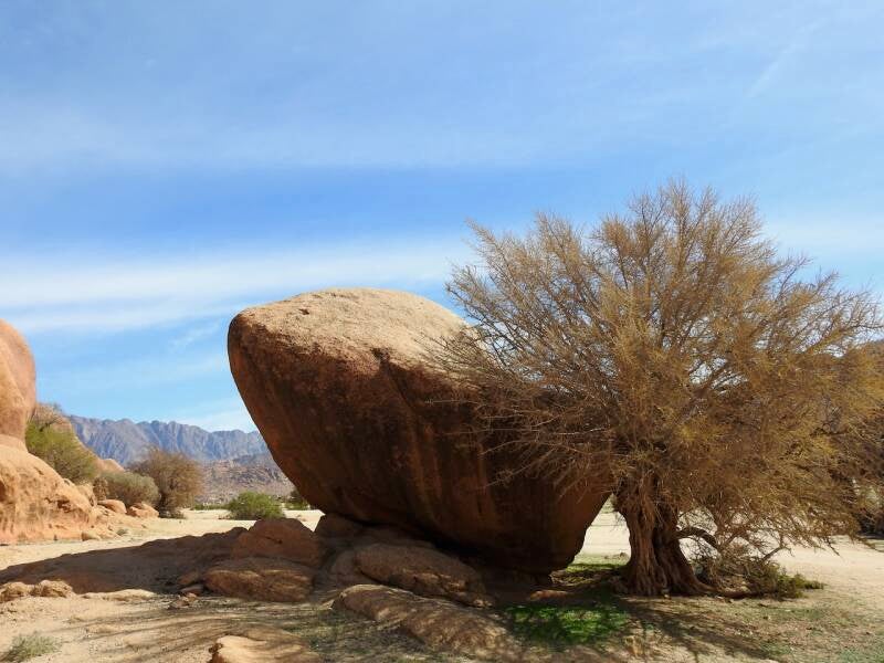 De rotsen rondom Tafraout bestaan hoofdzakelijk uit graniet, vandaar ook de mooie kleuren als de zon erop schijnt. In het kort komt het erop neer dat het keteldal ontstaan is door een combinatie van erosie en verwering van het granietgesteente. Graniet is een hard stollingsgesteente wat miljoenen jaren geleden diep in de aardkorst is ontstaan. In dat graniet zijn door o.a. afkoeling scheuren ontstaan, dat zijn zwakke plekken. In een proces wat miljoenen jaren geduurd heeft zijn door grote temperatuurverschillen tussen dag en nacht, wind en sporadische hevige regenval , die scheuren, de zwakke plekken, breder geworden. Los materiaal spoelde weg, er zat ook zandsteen tussen het graniet, sommige delen van het graniet werden daardoor sneller uitgehold dan andere. Zo is er een komvormig of zgn keteldal ontstaan tussen de ronde granietformaties . Rond omdat graniet verweert in die vorm, de zgn. bolverwering. Daardoor krijg je ook die kenmerkende afgeronde rotsblokken , die hier nog her en der verspreid liggen, vaak kolossale ‘stenen’ zo groot als huizen, op de bodem van de kom. En zie je hier prachtige vormen zoals bv de hoed van Napoleon, iets buiten Tafraout. En nu maar hopen dat er niemand is die deze uitleg afschiet.