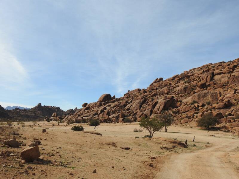 Hier staan we eigenlijk op de bodem van zo’n diepe kom , op de bodem van het keteldal met de steile bergwanden rondom ons . Het keteldal in Tafraout is ws ontstaan in de ijstijd doordat gletsjers langzaam over de berg schuurden en meegenomen stukken steen en rotsblokken zo een steeds diepere kom wisten te vormen. Na het smelten van het ijs is dit dal overgebleven. Dit keteldal is jonger dan Cirque de Navacelles, de erosie daar heeft misschien wel miljoenen jaren geduurd, dit keteldal is wellicht 100.000 jaar geleden ontstaan, Marokko was toen voor een deel met ijs bedekt, ook de Anti Atlas waar we nu zijn.