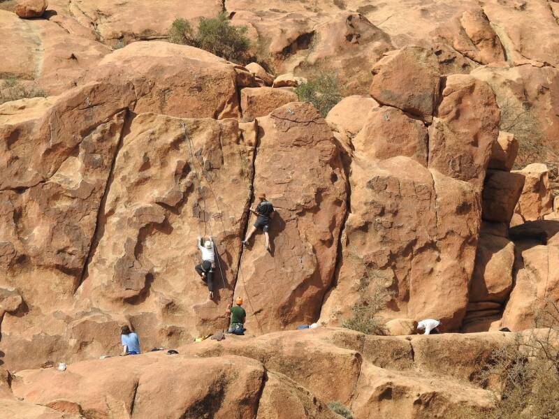 We zagen nog een groep jongeren die de steile wanden van de rotsen aan het beklimmen waren. We meenden aan de taal te horen dat het Marokkaanse jongeren waren, geluid voert verder dan dat wij dat duidelijk konden zien of dat inderdaad zo was. Omdat het windstil was voelde de zon lekker warm aan en genoten we van de wandeling, we zagen nog Zwarte Tapuiten en een Witkruintapuit.