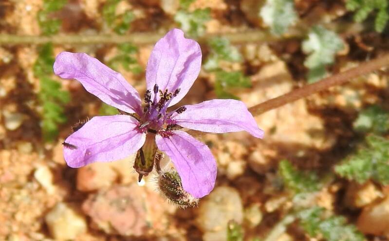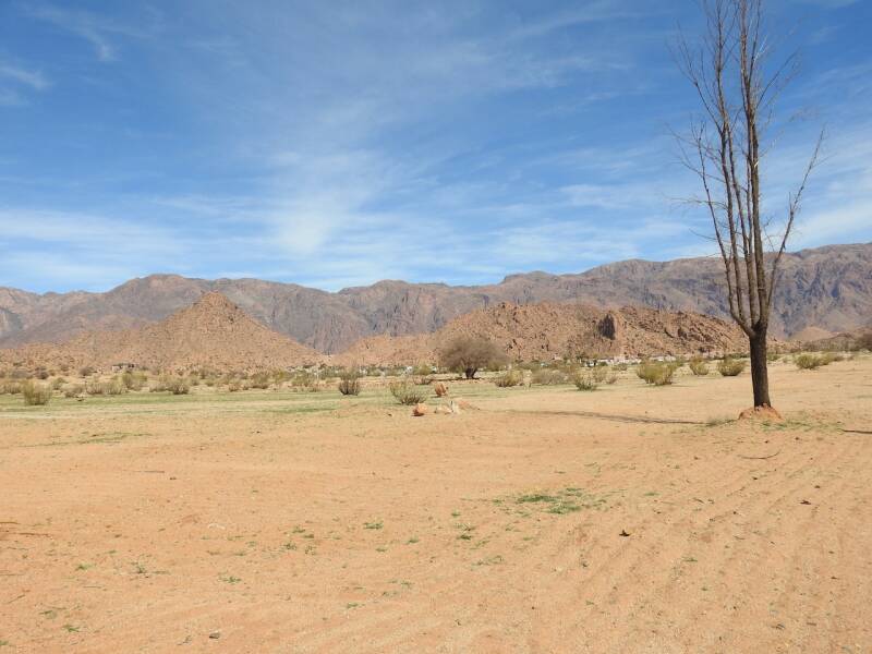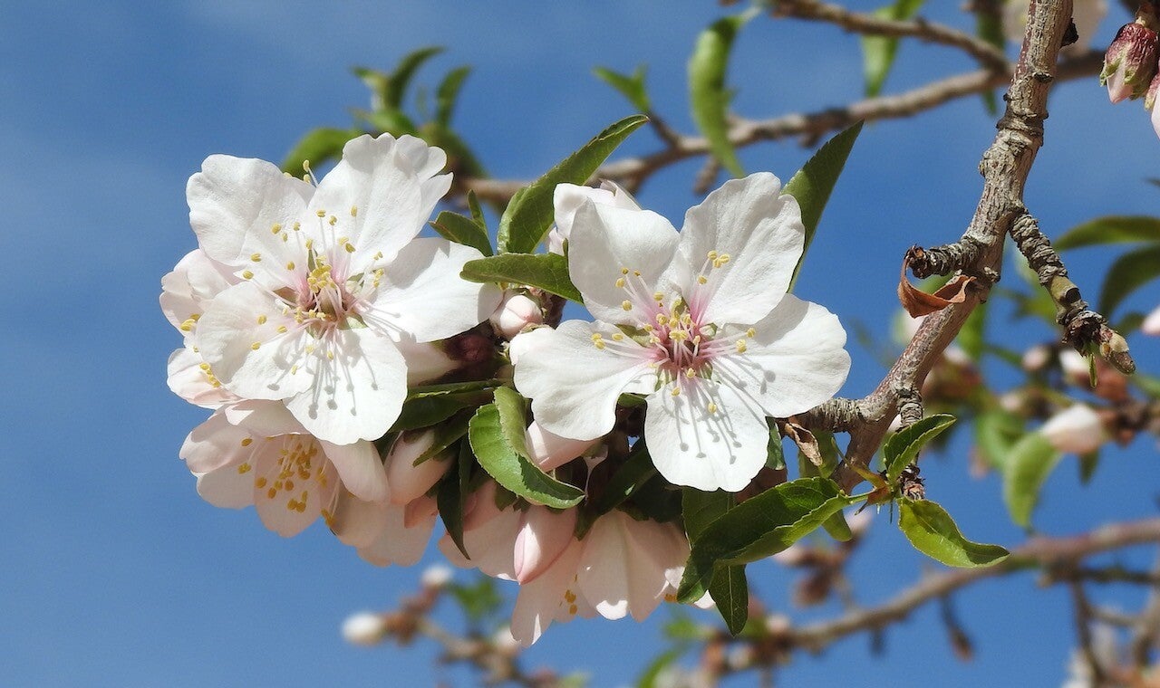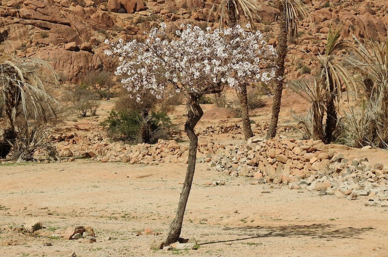 Door de regen die al weer even geleden ook hier overvloedig gevallen is zie je nu bloempjes die we eerder hier niet gezien hebben. We hebben nog geen bloeiende amandelbomen gezien door de droogte zijn er veel gestorven, wel een enkel bloeiend Abrikozen- of een Perzikboompje. Rondom de camper en elders in het dal staan momenteel veel gele bloempjes in bloei, dat is is Klein Zandkool , ook zie je wel Reigerbekjes bloeien..