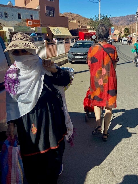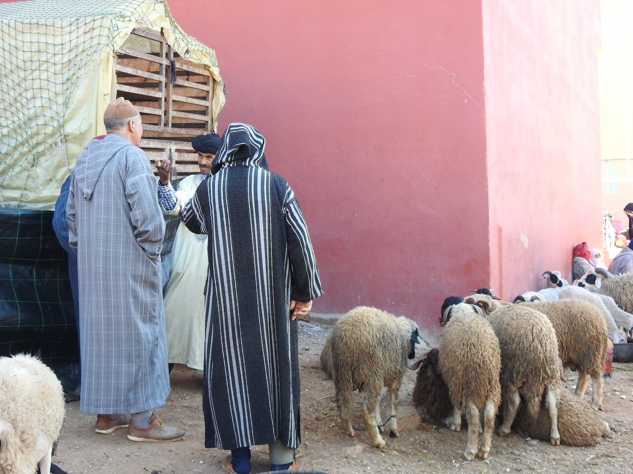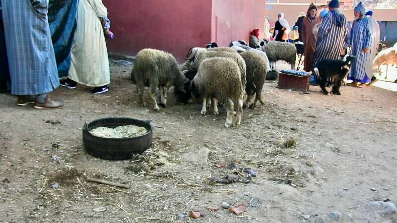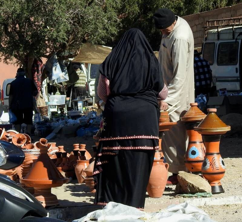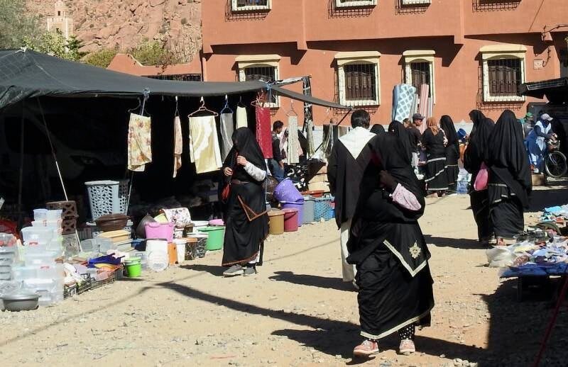 Er waren in verhouding aardig wat vrouwen op de been, op andere souks zie je vaak alleen mannen, hier niet. De vrouwen zijn gekleed in de typische klederdracht van de Ammeln, de stam die hier in Tafraout en omgeving woont . Het zijn zwarte wikkelrokken, afgebiesd met een gouden of andere kleur bandje. Maar natuurlijk zijn er ook uitzonderingen in het straatbeeld te zien, qua kleding bij vrouwen, bv een zwarte rok met een witte omslagdoek, dat staat meteen feestelijk tussen al dat zwart. Mannen van de Ammeln hebben een gestreepte boernoes van wat dikkere stof omdat het hier ook koud kan zijn. De Ammeln zijn altijd agrarisch gericht geweest, het waren boeren. Maar veel leden van deze stam staan bekend om hun ondernemingszin. Zij die wegtrokken uit de Ammeln vallei en Tafraout waren in de jaren 60 kruideniers door een groot deel van Europa. Nù zijn bepaalde families succesvol in de handel en andere economische activiteiten. Dat kun je zien aan de soort villawijk aan de periferie van het dorp Tafraout , daar staan kasten van huizen, ongetwijfeld wandelen we daar weer eens heen. Niet iedereen is natuurlijk rijk , je hebt hier ook armoe, de tegenstelling is ook hier soms schrijnend net als elders in Marokko.