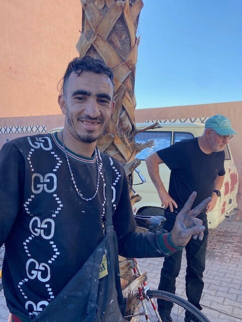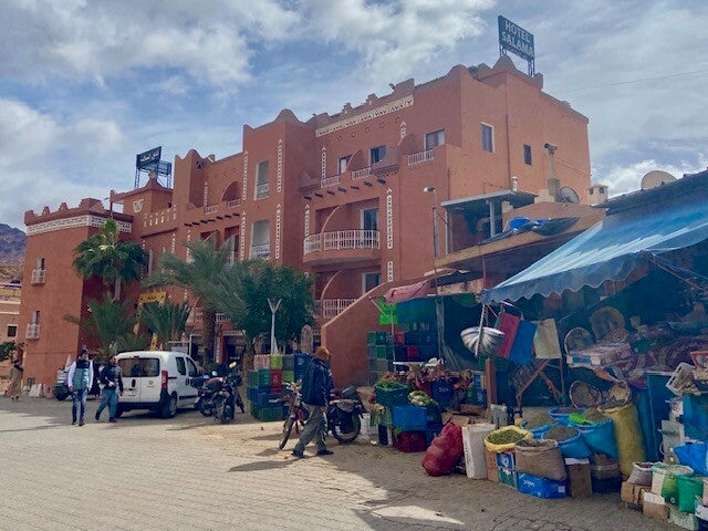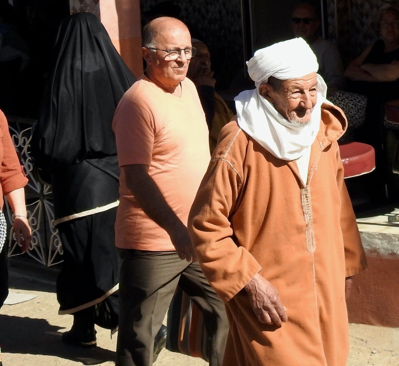 We liepen na het eten naar buiten en Everdien zag Petra en Freddy, onze garageman uit Vierakker bij Zutphen. We hebben even gebabbeld, ook zij gaan naar het keteldal, we zullen elkaar nog wel ontmoeten een dezer dagen. Het heeft wel iets vervreemdend elkaar in een andere rol in Marokko tegen te komen.