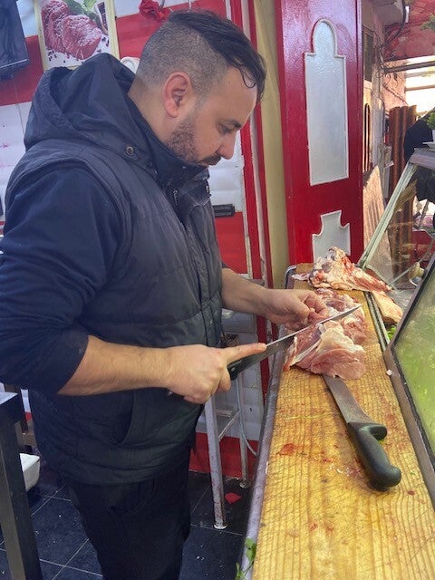 We hebben, omdat we dichtbij het centrum stonden toen we bij Mohamed waren, boodschappen gedaan, o.a. camembert, een Marokkaanse kruidenkaas, een soort Boursin en een kuipje smeerbare geitenkaas. Traditiegetrouw hadden we bij de slager een complete ossenhaas besteld, gewicht was 1900 gram. ( er zijn gisteren 5 mensen geweest voor ossenhaas, ik had hem jullie beloofd) De prijs was 1800 Mad per kilo., in Nederland zo’n €75,- per kilo dus meer dan 4x zo duur. Everdien heeft er 14 biefstukken van gesneden, wat snijdsel gaat terug naar de slager die er dan overheerlijk gehakt van draait. We kwamen enkele bekenden tegen, mensen die net gearriveerd waren, anderen die vertrokken zonder dat we in de gelegenheid waren geweest om elkaar eerder te ontmoeten.