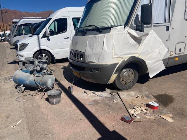 Uiteindelijk was onze camper pas om 17.00 uur klaar, toen we uit eten waren kon de jongen niet de bumper aan de achterkant afwerken omdat die in de zon stond. Te laat naar onze zin konden we terug naar onze plek in het dal want de lak en de celluloselak daaroverheen moesten eerst nog 2,5 uur drogen.