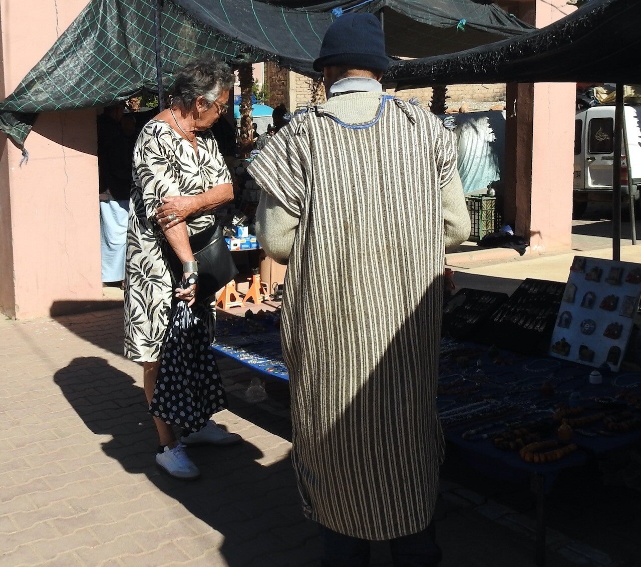 Vandaag zijn we weer naar de wekelijkse souk geweest, het was drukker dan gisteren, met bezoekers en bemenste kraampjes. Zo’n souk trekt ook mensen uit de wijde regio zodat het een sociale functie heeft, meer dan louter om inkopen te doen. Sommige mensen treffen elkaar zo 1x per week en worden er handen geschud, omhelsd. We hadden eigenlijk alleen maar een nieuw waterketeltje nodig maar konden niet de juiste maat vinden. We kwamen ook die nodige bekenden tegen en liepen Gerrie en Annie tegen het lijf , die waren gisteren in Tafraout aangekomen nadat ze 6 dagen geleden op een middag uit de Achterhoek waren vertrokken. Die hadden vast heel veel zin om hier heen te gaan. Ook Marga en Hans hadden we nog niet gezien, ze waren 3 weken al hier geweest en moesten voor een nieuwe achteras naar Agadir en zijn weer terug, aan de kust bij Agadir was het weer regenachtig. Voor ons had de souk dus ook een sociale functie. Op het terras van hotel Tanger die aan de souk ligt, wilden we een glas jus d’orange drinken, daar zaten André en Marjos ookl. Vanaf het terras kun je mooi met de Nikon ingezoomde foto’s maken. Helaas, het toestel was niet aan de praat te krijgen. Daarom met de iPhone gefotografeerd, kun je niet zo mooi inzoomen.