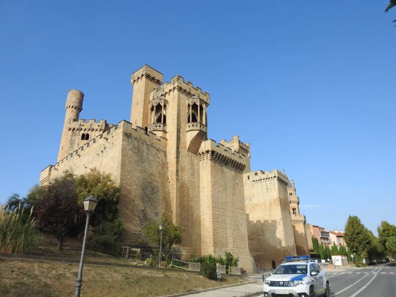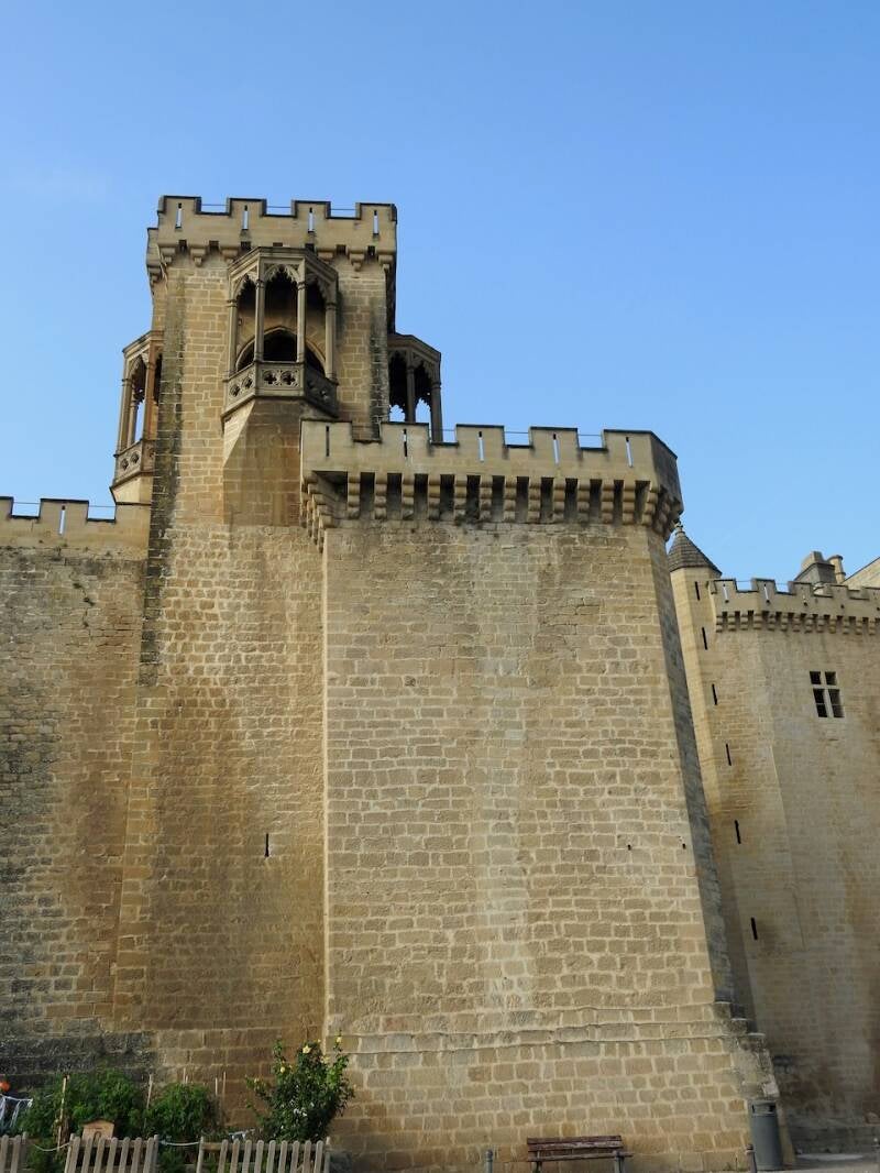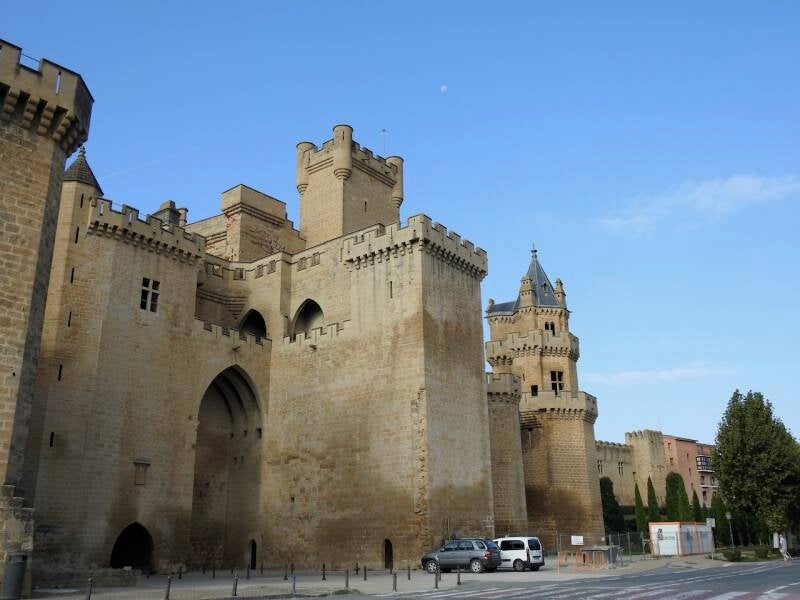 Vanmorgen hebben we afscheid genomen van Renée en Sinti die richting Burgos gaan. We zijn eerst 20 km verder gereden naar Olite, een middeleeuws stadje met een groot kasteel in het centrum. De late middeleeuwen betekende voor Olite een echte gouden eeuw toen het werd gekozen als een van de favoriete verblijfplaatsen van de koningen van Navarra. Het Koninklijk Paleis van Olite, het hof van de Navarrese koningen, was een van de meest luxueuze middeleeuwse kastelen in Europa. Het was een pareltje van Navarese gotiek. Na een felle brand werd het in de 19e eeuw herbouwd.