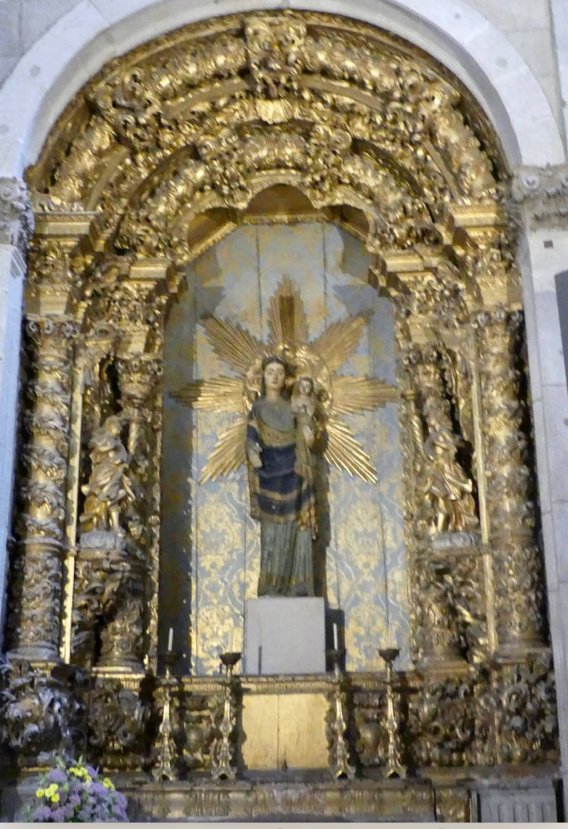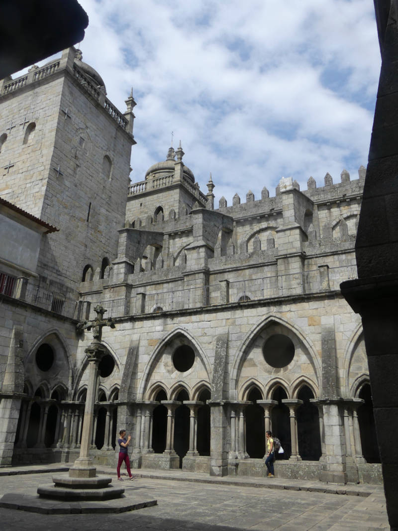We zijn vervolgens omhoog geklommen, Porto is gebouwd tegen een heuvel en dat vergt enige inspanning om bij bezienswaardigheden te komen, ook al omdat we wat problemen hebben met de knieën e.d. We zijn naar de kathedraal Sé do Porto gelopen, die was dichtbij dus dat omhoog lopen viel wel mee. We moeten er voor waken niet kathedraal-moe te worden maar we zijn toch naar binnen gegaan. De kathedraal is wel een de oudste monumenten van Porto en het oudste Romaanse gebouw in de stad. Het werd gebouwd in begin 12e – 13e eeuw en was oorspronkelijk een vestingkerk wat je nog kunt zien aan de kantelen. In de tijd van de Barok , na 1700, zijn er verschillende elementen veranderd, zodat er in de loop der eeuwen een mix aan bouwstijlen is ontstaan.