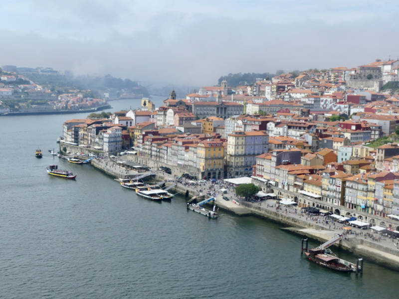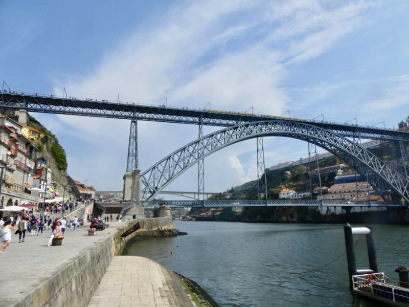 Om niet een overdosis aan azulejos te krijgen zijn we een stukje afgedaald om in de volkswijk Ribeiro te komen. Deze bestaat uit een wirwar van kleine straatjes en het lijkt wel of de bewoners de opdracht hebben gekregen om toch vooral wat wasgoed aan de lijn tegen de huizen te laten wapperen om de toeristen te behagen. We zijn weer iets omhoog gelopen om naar de ijzeren boogbrug Luis I van een compagnon van Gustave Eiffel, Théophile Seyrig. We zijn over de brug gelopen tot bijna aan de overkant, de linkeroever, daar waar de porthuiskelders zijn, daar gaan we morgen heen. Je hebt vanaf de brug wel een mooi uitzicht over de Douro en op de wijk Ribeiro met prachtige huizen en terrassen aan de kade.