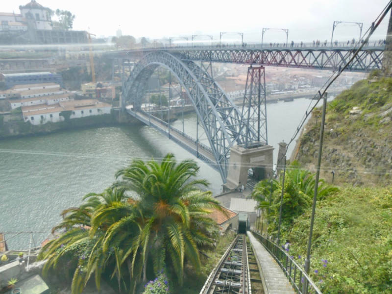 Met de kabelbaan naar boven, beneden de iets mistige Douro.