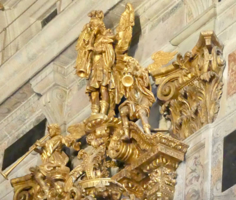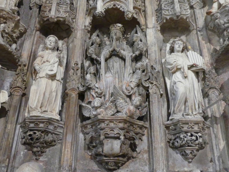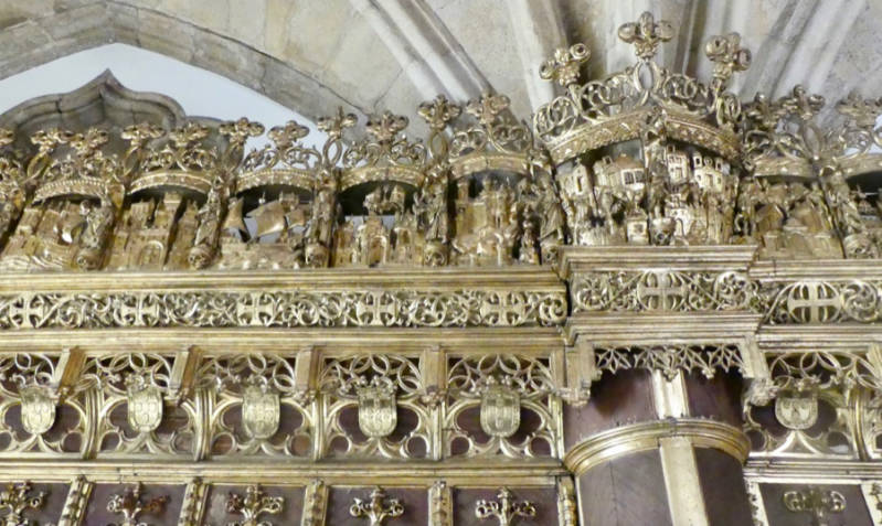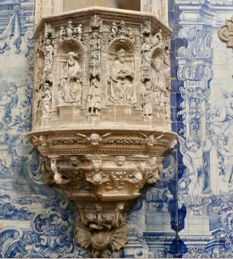 Via het klooster kon je via enige trappen hoog op het kerkbalkon komen, hier waren de koorgestoelten met oa afbeeldingen van Portugese ontdekkingsreizen. Er was veel bladgoud aanwezig langs de wanden, in reliëfs verwerkt