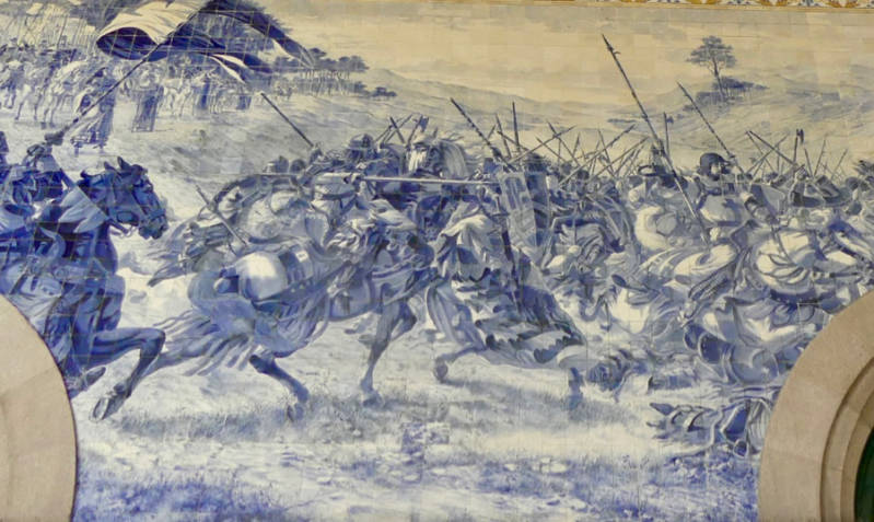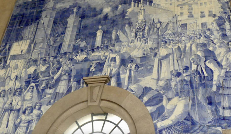 We zijn vanmorgen met de trein naar Porto gegaan. Een ticket voor de trein kost eenmalig €0,50, die kun je dan opladen voor het bedrag dat de zones kosten wat je gaat rijden. 65+’rs betalen half geld dus voor €0,90 pp waren we in 25’, in het centrum van Porto. We waren meteen op het station, São Bento, die een van de dingen was die we wilden bezichtigen in Porto, dat kwam mooi uit. De eerlijkheid biedt te zeggen dat we de heenreis voor niks hebben gereden, er was een monteur met de kaartjesautomaat bezig, we moesten maar een kaartje kopen bij de conducteur maar die hebben we niet gezien. Het station São Bento is een kopstation, het is beroemd omdat de wanden in de stationshal zijn bekleed met azulejos. Het station is gebouwd aan het eind van de 19e eeuw en de azulejos zijn gemaakt door de schilder Jorge Colaco. Het zijn voorstellingen van oude ambachten en militaire gebeurtenissen uit de geschiedenis van Portugal.