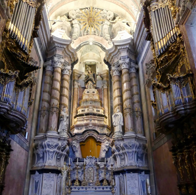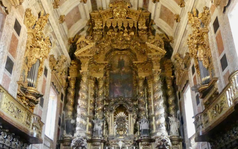 Het interieur bestaat uit graniet en marmer en natuurlijk goud, naast barok houtsnijwerk. Niet het mooiste interieur wat we ooit gezien hebben maar wel zeker de moeite waard. Vlakbij ligt een prachtige boekwinkel waarvan het art-deco interieur als bijzonder mooi wordt beschreven. Zo mooi dat je niet alleen moet betalen om binnen te komen maar dat je beter online een kaartje kunt kopen om de lange wachtrij te ontlopen. Dat hebben we maar overgeslagen, evenals de kerk São San Francisco die wellicht het mooiste interieur van de kerken in Porto heeft. Je mag daar echter niet fotograferen , we vinden dat het dan niet een bezoek waard is. Vraag ons niet hoe het interieur van de kathedraal van Burgos is die we 5 jaar geleden bezocht hebben. Naarmate we ouder worden hebben we steeds vaker foto’s nodig als ondersteuning van onze herinneringen, dus dan maar geen San Francisco.