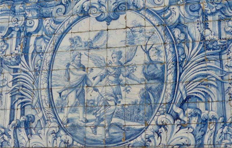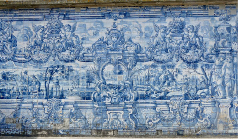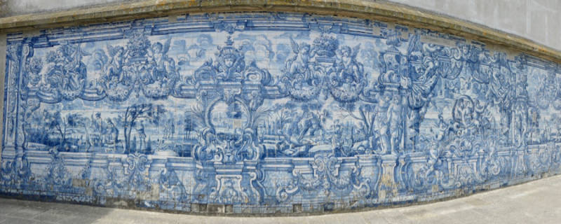Panorama foto van één van de 2 muren met azulejos boven op het terras van het klooster.