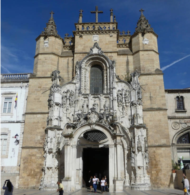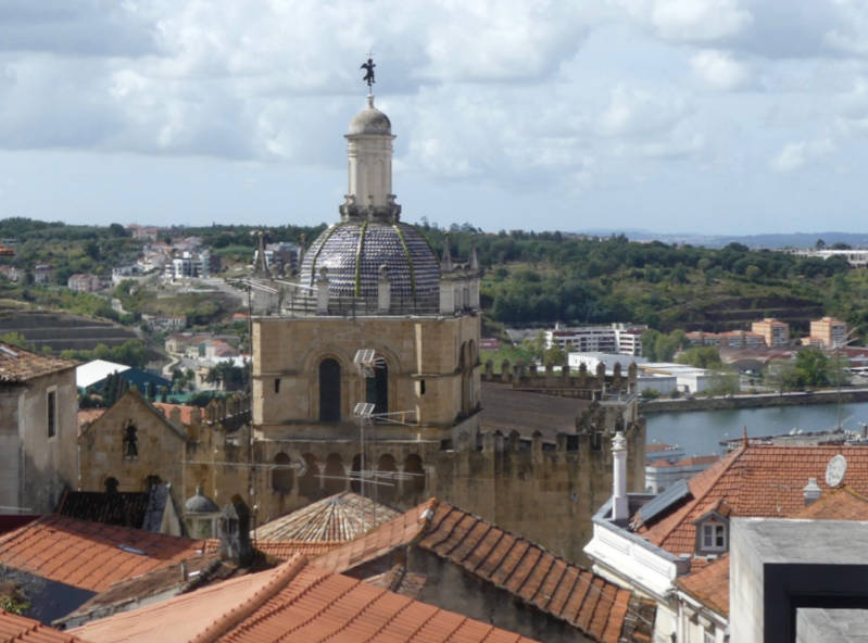 We zijn daarom eerst naar de oude binnenstad gelopen, die niet al te ver van de cp af ligt. We waren in het centrum na zo’n 20min. lopen. Omdat het toeristenbureau op dat moment gesloten was, zijn we zelf maar aan de klim door de straten naar boven begonnen. We wilden naar de universiteitsbibliotheek en onderweg daarheen hadden we op internet al gezien dat er 2 kathedralen zijn, de ene is de oude kathedraal de Sé Velha. Het interieur is vast mooier dan het exterieur, dat is plomp. Het is wel het oudste klooster van Portugal, het dateert uit 1162 en het is Romaans.