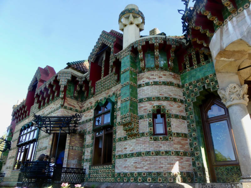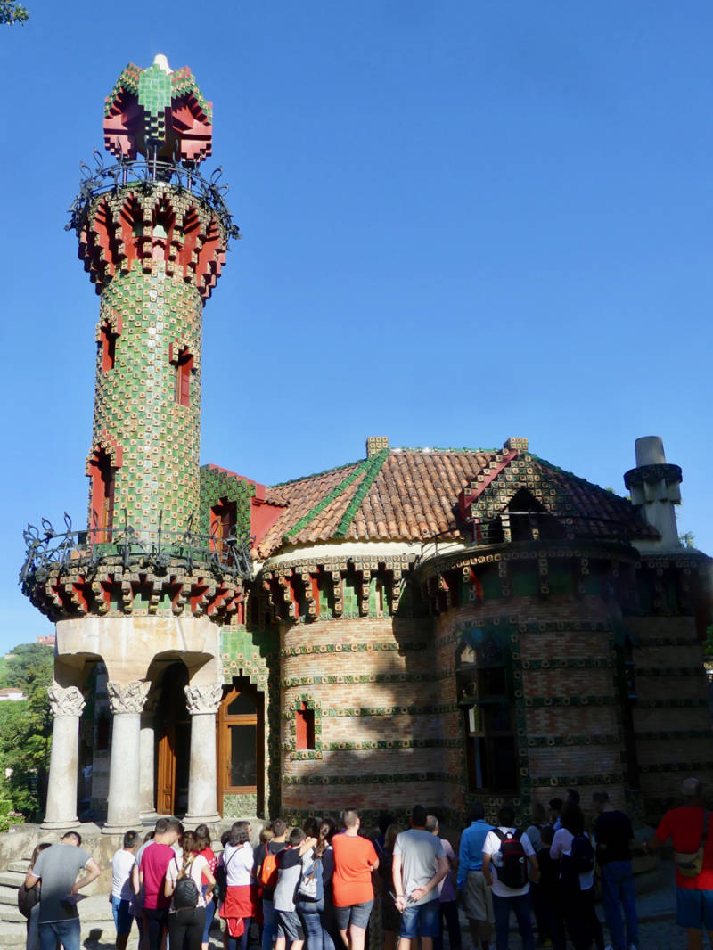 Aan het eind van de middag zijn we het dorp in geweest. Ook de 1ste indruk van het dorp is erg positief. Morgen gaan we het verder verkennen, nu zijn we naar het stadspaleis van Gaudí geweest. Het is een van zijn eerste meesterwerken(1883-1885) en het wordt beschouwd als de aanzet tot het ontstaan van de modernistische beweging in Spanje. We vonden de buitenkant erg indrukwekkend, het is betegeld met geglazuurde tegels met zonnebloemen en zonnebloembladeren . Het interieur bestaat uit veel kamers maar we hebben niet alles kunnen zien doordat er groepen werden rondgeleid en die vulden zo’n kamer dan compleet. Maar er waren leuke elementen te ontdekken, sommigen voorstudies voor latere werken van Gaudí.