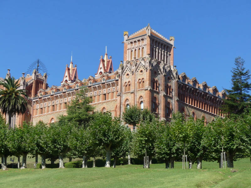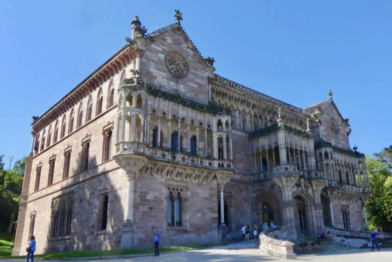 Je kunt hier de Ruta Monumental en de Ruta Modernista wandelen. Vanmorgen hebben we een deel van de route Modernista gewandeld. Vlak bij het paleis van Gaudí ligt een mausoleum in de vorm van een kapel, de Capilla Pantéon. Het is het eerste gebouw in modernista stijl in Comillas en er liggen crypten met de 2 jong gestorven zonen van de markies van Comillas . Naast de kapel ligt het Palacio de Sobrellano, die werd gebouwd in 1881 in opdracht van de markies van Comillas. Het paleis is alleen te bezichtigen in groepen van maximaal 60 personen, we zouden 3 kwartier moeten wachten om naar binnen te kunnen.
