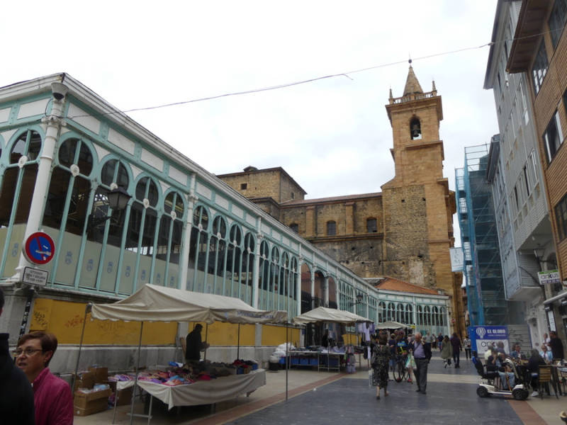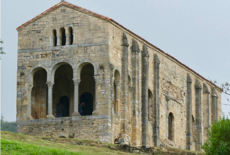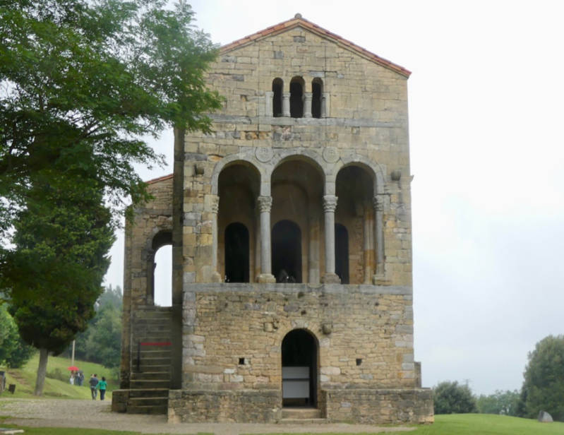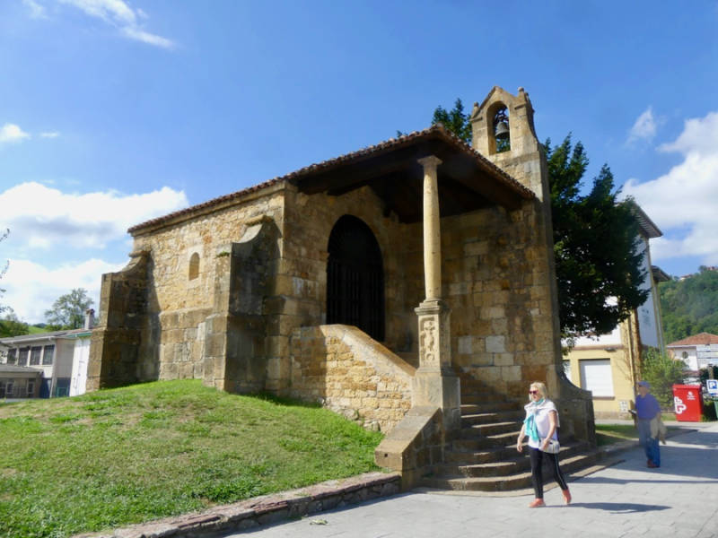We zijn eerst naar een bezienswaardigheid net buien Oviedo gereden, een pre romaanse kerk uit 848, de Santa Maria de Naranco. Oorspronkelijk gebouwd als aula regia, waar raadsvergaderingen van het hof van koning Ramiro I werden gehouden, later kerk geworden. Het is een eenbeukige kerk die verlicht wordt door zonlicht dat door de bogengalerij valt. De kerk is een uitstekend voorbeeld van de pre romaanse bouwstijl welk die is geïnspireerd door Visigotische tradities, de Asturische bouwstijl. Deze stijl werd o.a. gekenmerkt door het gebruik van steunberen en hoge bogen en gebeeldhouwde decoraties. Het begon te regenen, we hebben niet gewacht tot we naar binnen konden om onder leiding van een gids het interieur te bezichtigen, we zijn naar de cp in een buitenwijk van Oviedo gereden. Van hier loopt een bus naar het centrum van Oviedo, voor €1,20 ben je in het centrum.