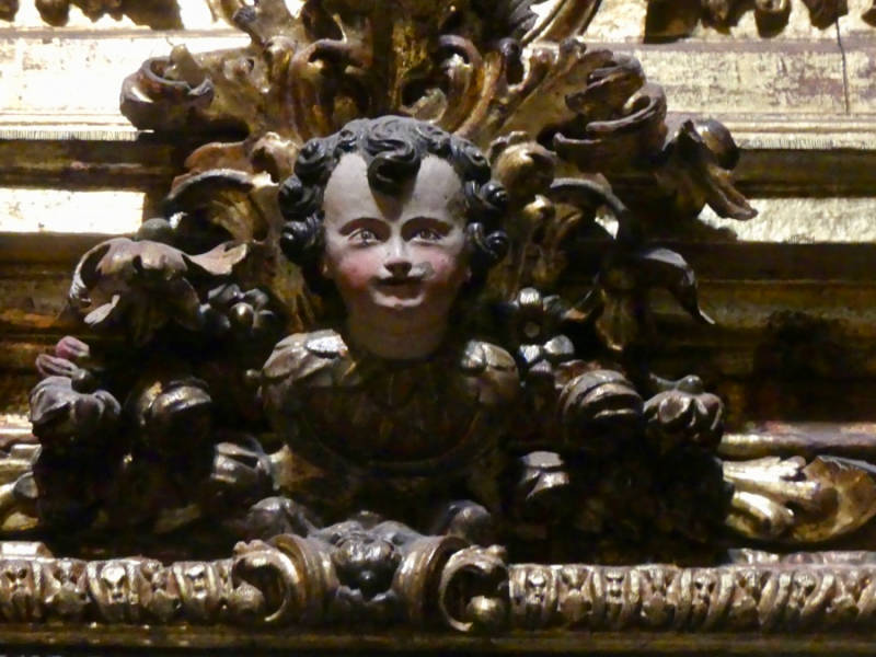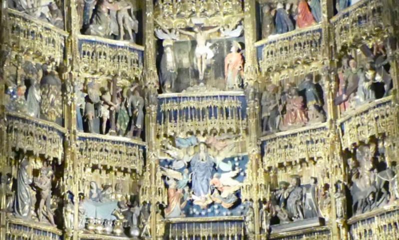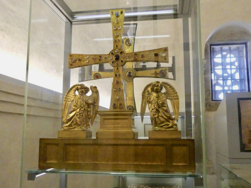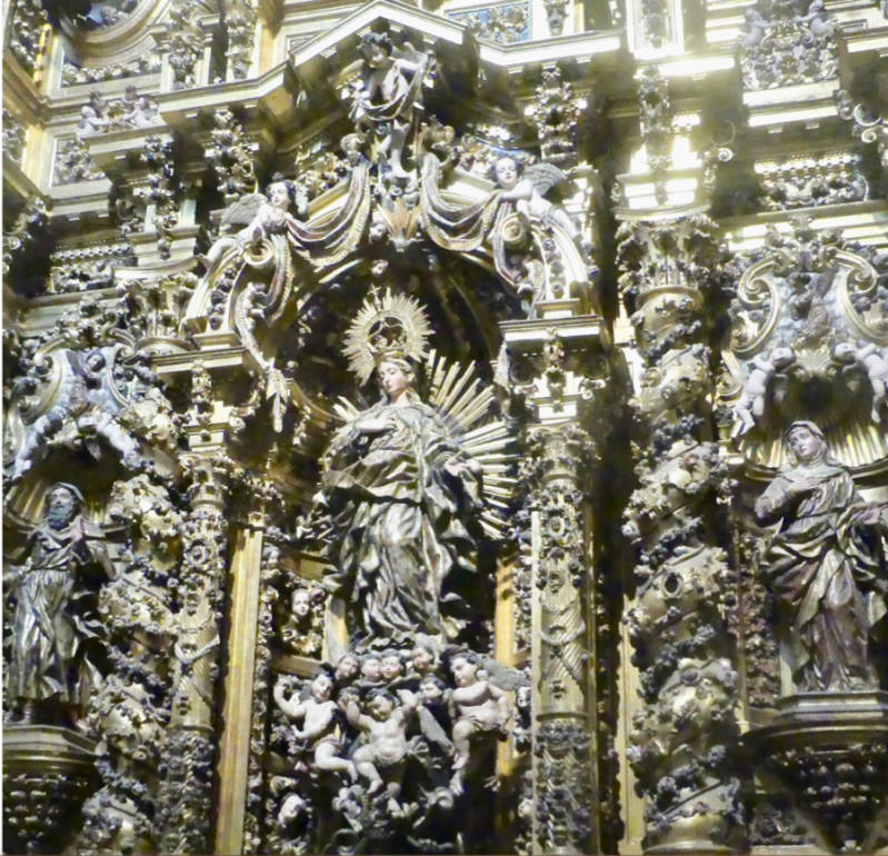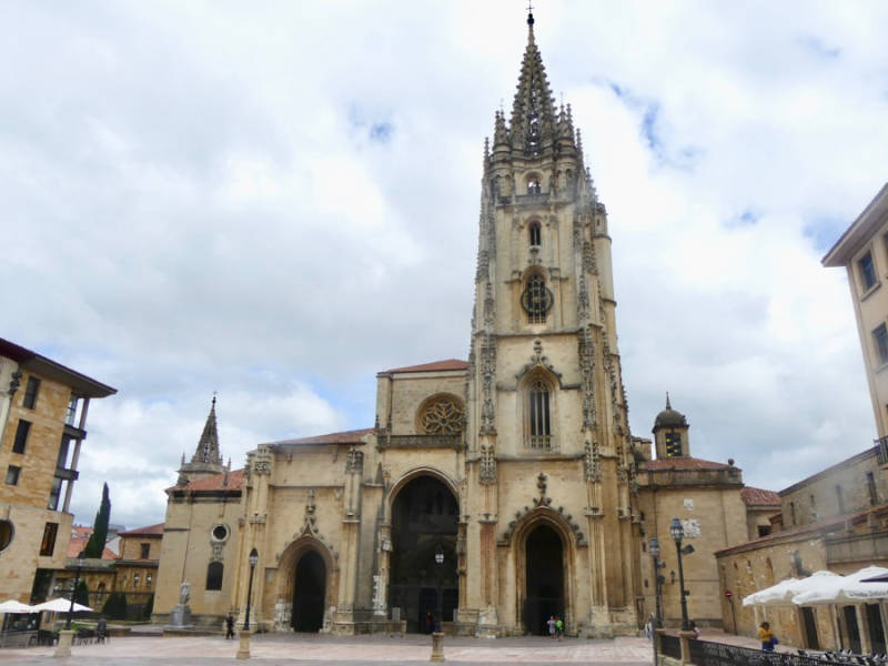 We zijn naar het middeleeuwse plein Plaza de Alfonso II gegaan, daaraan ligt de flamboyant-gotische kathedraal de San Salvador, naast wat middeleeuwse gebouwen. Het gebouw maakte aan de buitenkant niet veel indruk op ons, het interieur is wel de moeite waard maar we hebben al zoveel katholieke pracht en praal gezien dat we de schoonheid hier vonden in de optelsom van wat je kunt zien. Als je binnenkomt zie je meteen het reusachtige vergulde altaar retabel van Giralde van Brussel, een van de grootste van Spanje. Je kunt een route volgen die naar de heilige kamer gaat die in een pre romaanse kapel die is gebouwd in de 9e als kerk bij het paleis van Alfonso II, hier wordt ook het overwinningskruis bewaard uit de 8ste eeuw. ( zie ook verslag gisteren).Daarnaast is een museum waar vooral veel rijk versierde monstransen te zien zijn. Via een bijbehorend klooster kom je uit aan de achterkant van het hoofdaltaar waar wel 15 nissen waren met grote vergulde altaarstukken waarop allerlei bijbelse taferelen waren te zien. Het belangrijkste is het grote barokke altaarstuk uit de 18e eeuw ‘de onbevlekte ontvangenis’.