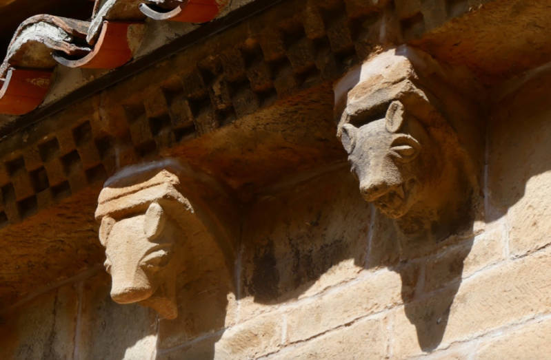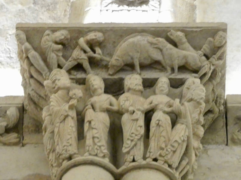 De versierde kapitelen met bas-reliëfs , hier 2 lichamen met één hoofd