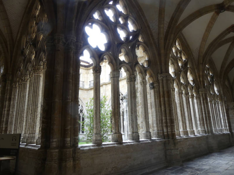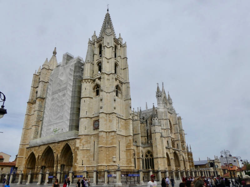 De kathedraal van León daarentegen vonden we indrukwekkend, de goudkleurige zandsteen geeft een lichte uitstraling. De 3 portalen bij de ingang waren uitbundig, fantasierijk versierd alsof een beeldhouwer onder invloed van paddo’s aan de gang was geweest. Niet alles was surrealistisch, er waren afbeeldingen van Bijbelse taferelen o.a. ‘het laatste oordeel.’ Met de bouw van de kathedraal werd begonnen in het midden van de 13e eeuw en de bouw heeft bijna 50 jaar geduurd. Na 7 eeuwen begint men zich nu zorgen te maken over de aantasting van de steen door luchtvervuiling Of dat de reden is waarom hij gedeeltelijk in de steigers staat weten we niet.