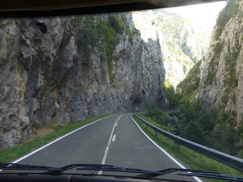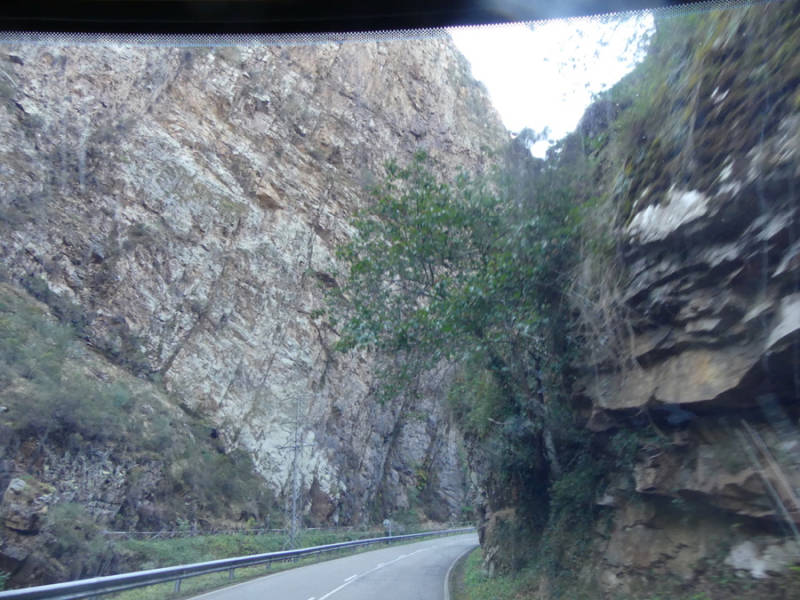 We bedachten tegen 16.00 uur dat het wellicht beter was om vanmiddag naar León te rijden, ’s morgens is de kans op laaghangende bewolking groot, we moesten een pas van 1587m over. Dus hebben gepakt en er volgde een spectaculaire rit door een kloof naar de pas, een schitterende rit langs een riviertje. Wel af en toe smal en het grootste deel moest je in de 2e versnelling klimmen. Er was nogal wat verkeer op de weg, mensen die een uitstapje maakten op de zondag. Boven op de pas had je een geweldig uitzicht, de afdaling was een stuk makkelijker.
